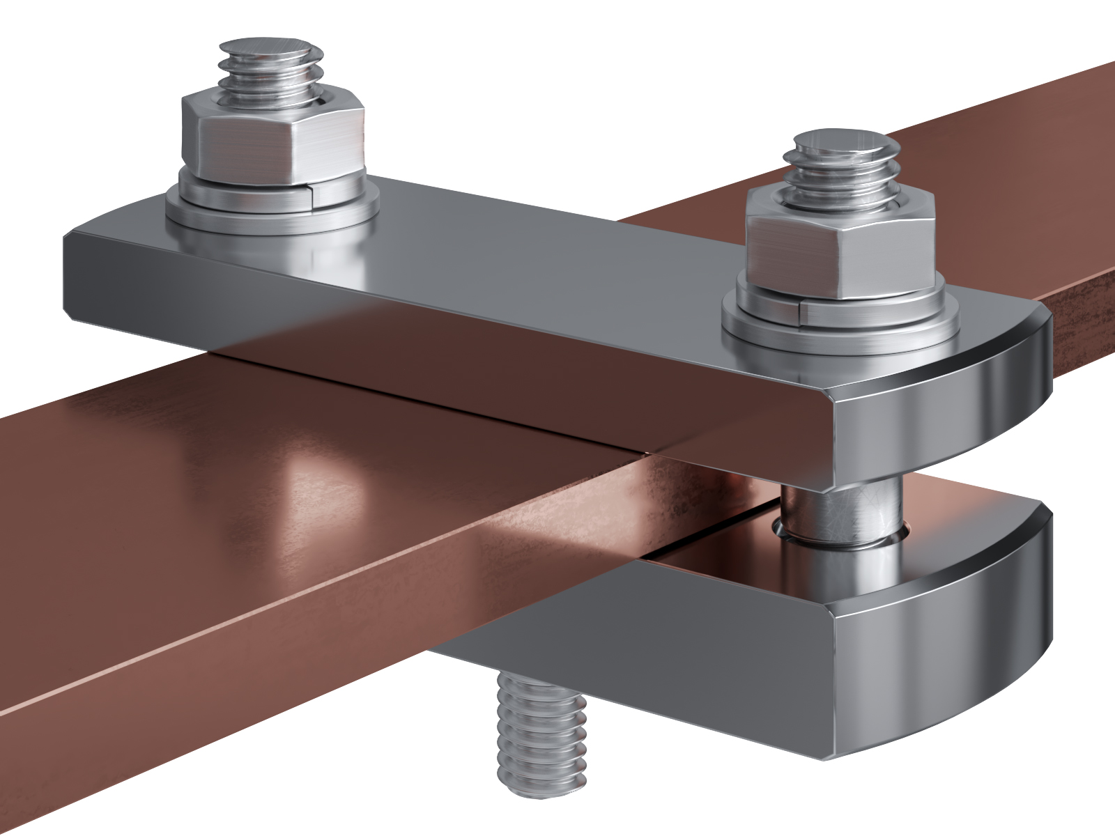 Schienenträger aus vernickeltem Messing zur Befestigung und Sicherung von Stromschienen aus Kupfer