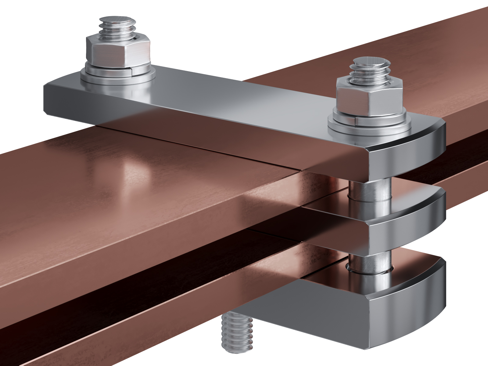 Schienenträger aus vernickeltem Messing zur Befestigung und Sicherung von Stromschienen aus Kupfer