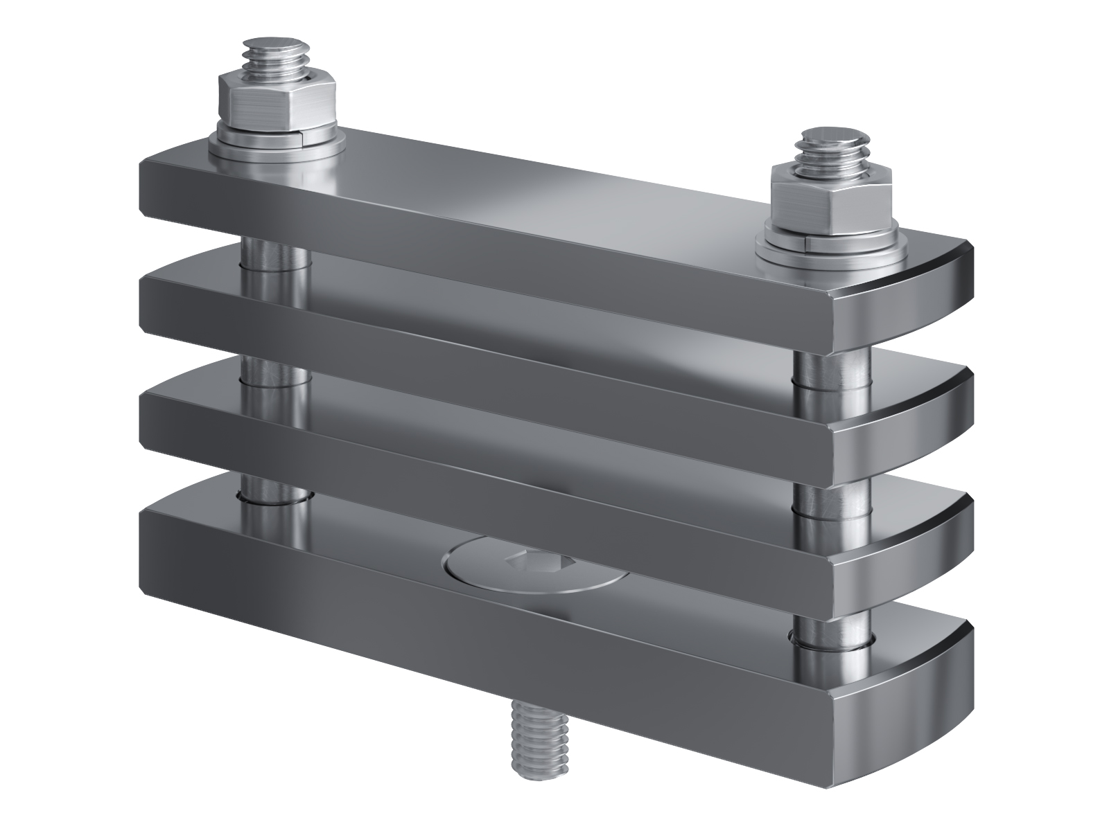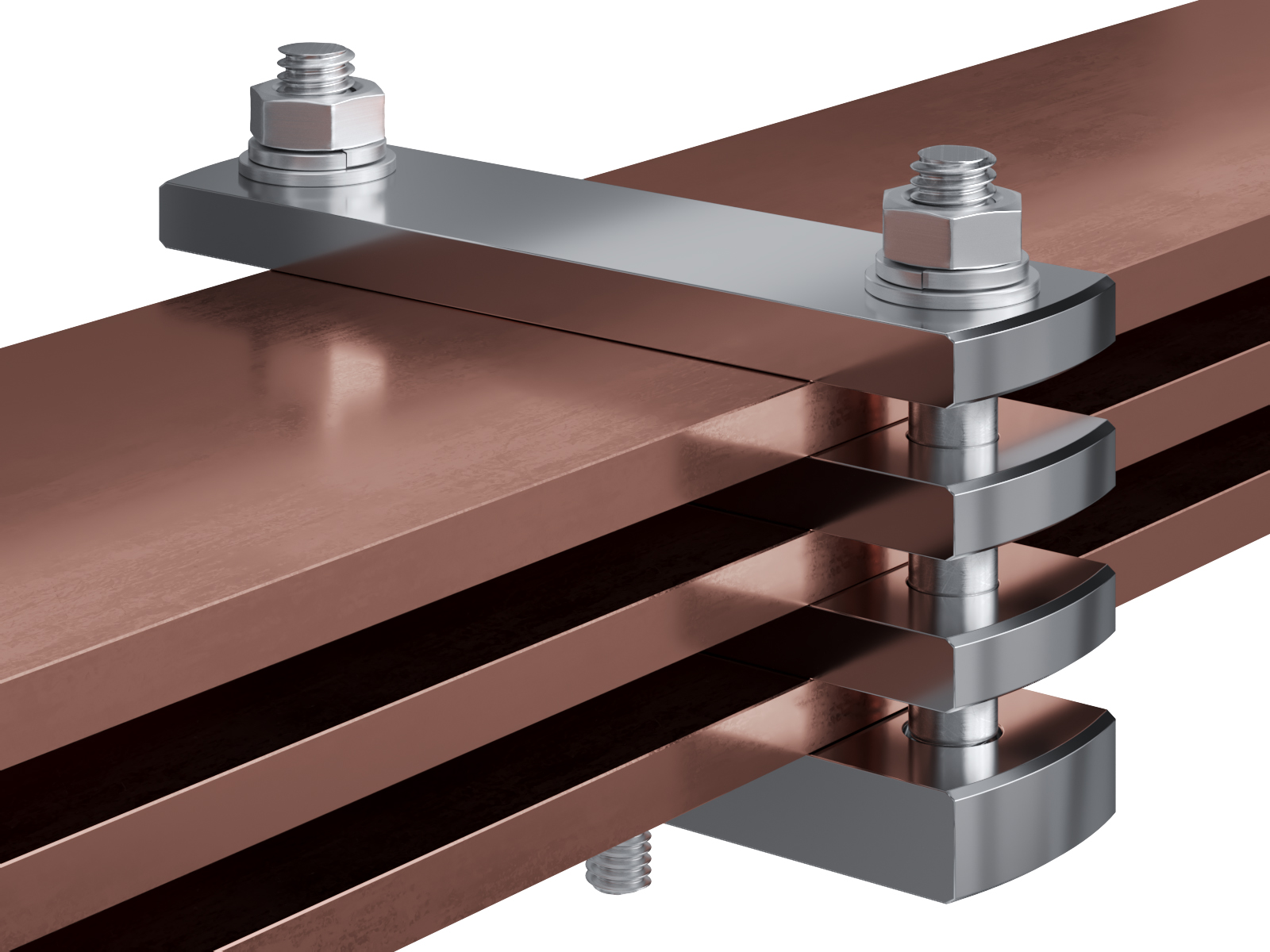 Schienenträger aus vernickeltem Messing zur Befestigung und Sicherung von Stromschienen aus Kupfer