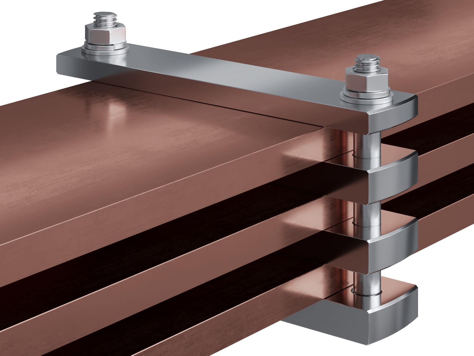 Schienenträger aus vernickeltem Messing zur Befestigung und Sicherung von Stromschienen aus Kupfer