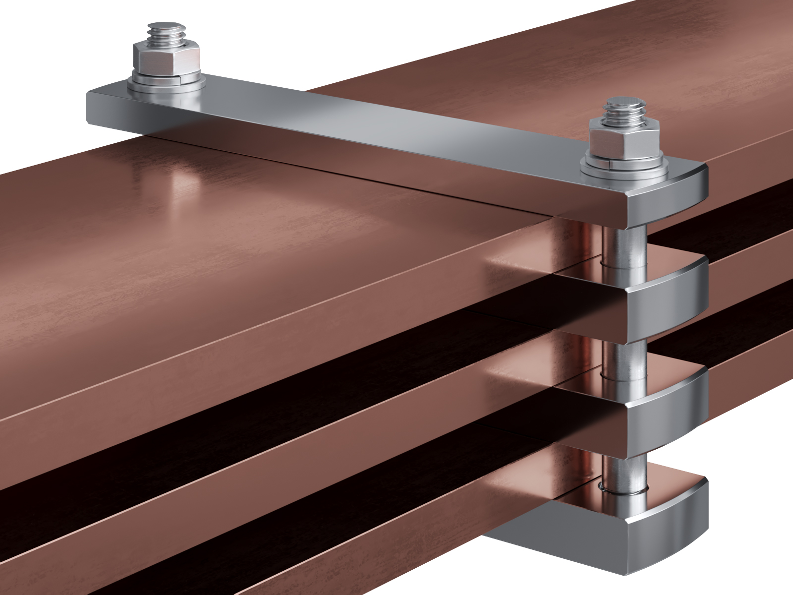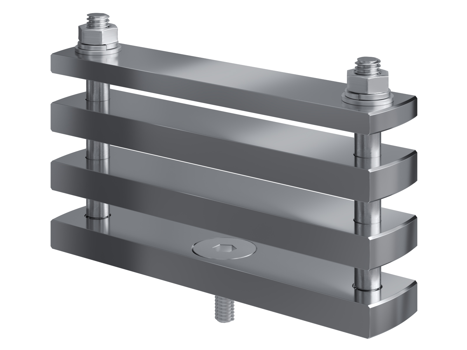 Schienenträger aus vernickeltem Messing zur Befestigung und Sicherung von Stromschienen aus Kupfer