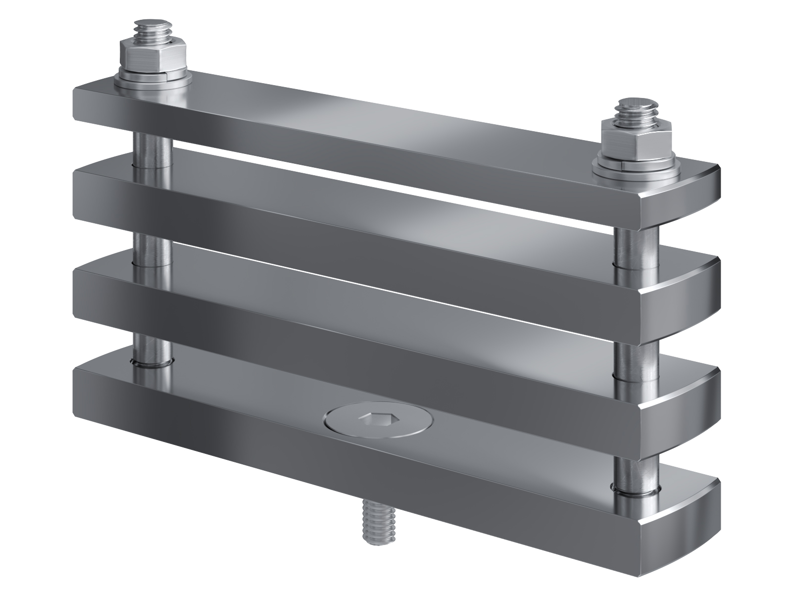 Schienenträger aus vernickeltem Messing zur Befestigung und Sicherung von Stromschienen aus Kupfer
