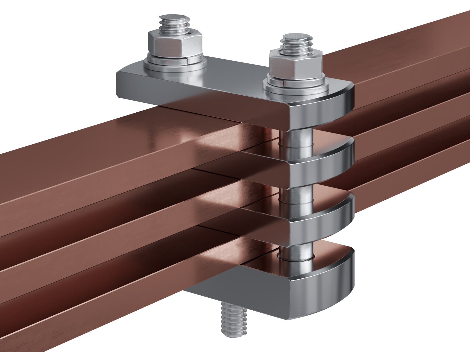 Schienenträger aus vernickeltem Messing zur Befestigung und Sicherung von Stromschienen aus Kupfer