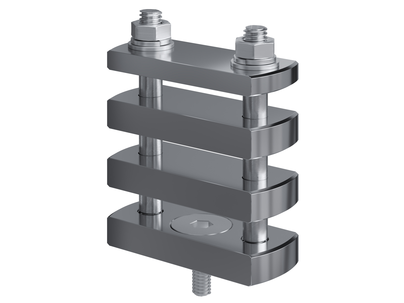 Schienenträger aus vernickeltem Messing zur Befestigung und Sicherung von Stromschienen aus Kupfer