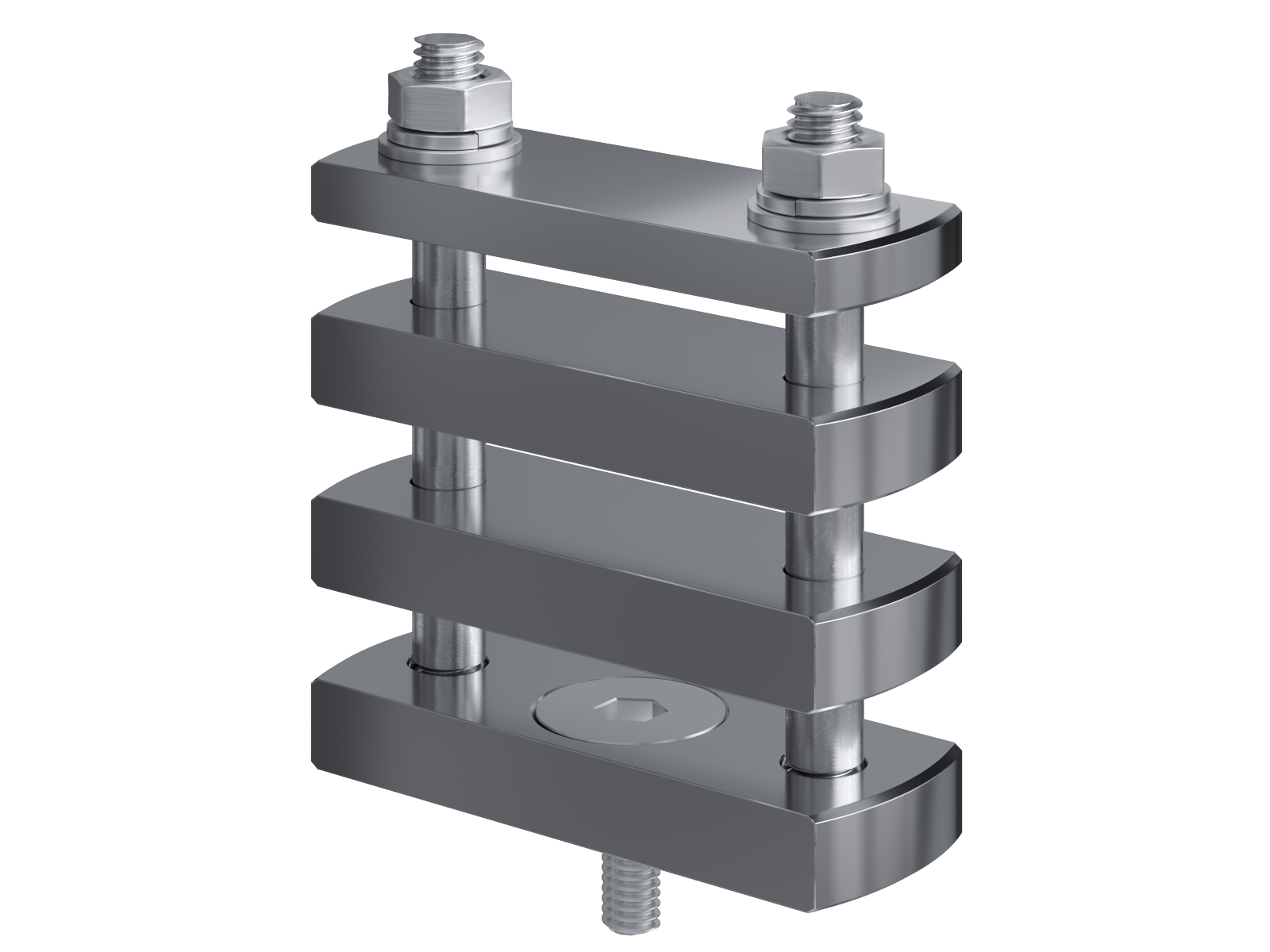 Schienenträger aus vernickeltem Messing zur Befestigung und Sicherung von Stromschienen aus Kupfer