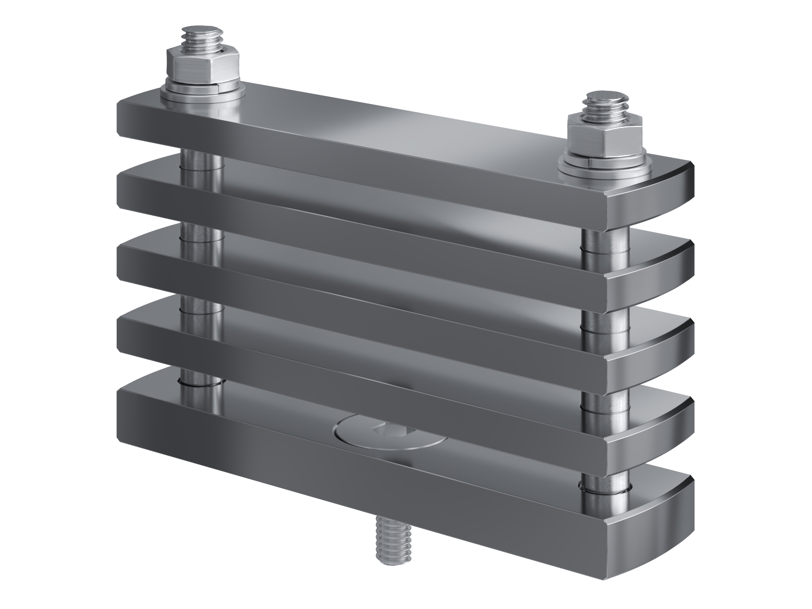 Schienenträger aus vernickeltem Messing zur Befestigung und Sicherung von Stromschienen aus Kupfer