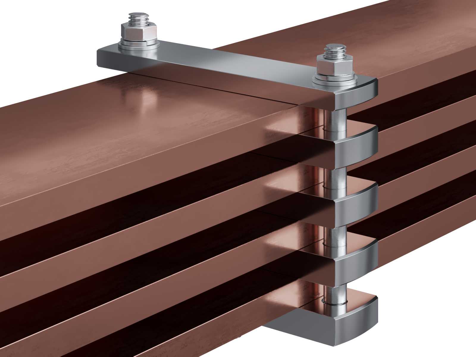 Schienenträger aus vernickeltem Messing zur Befestigung und Sicherung von Stromschienen aus Kupfer