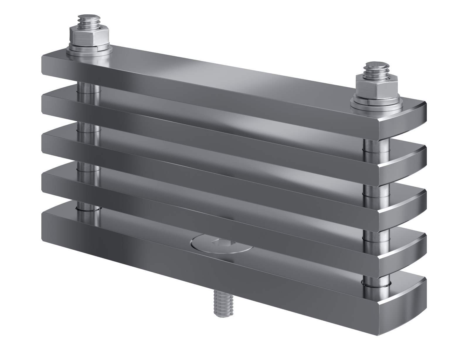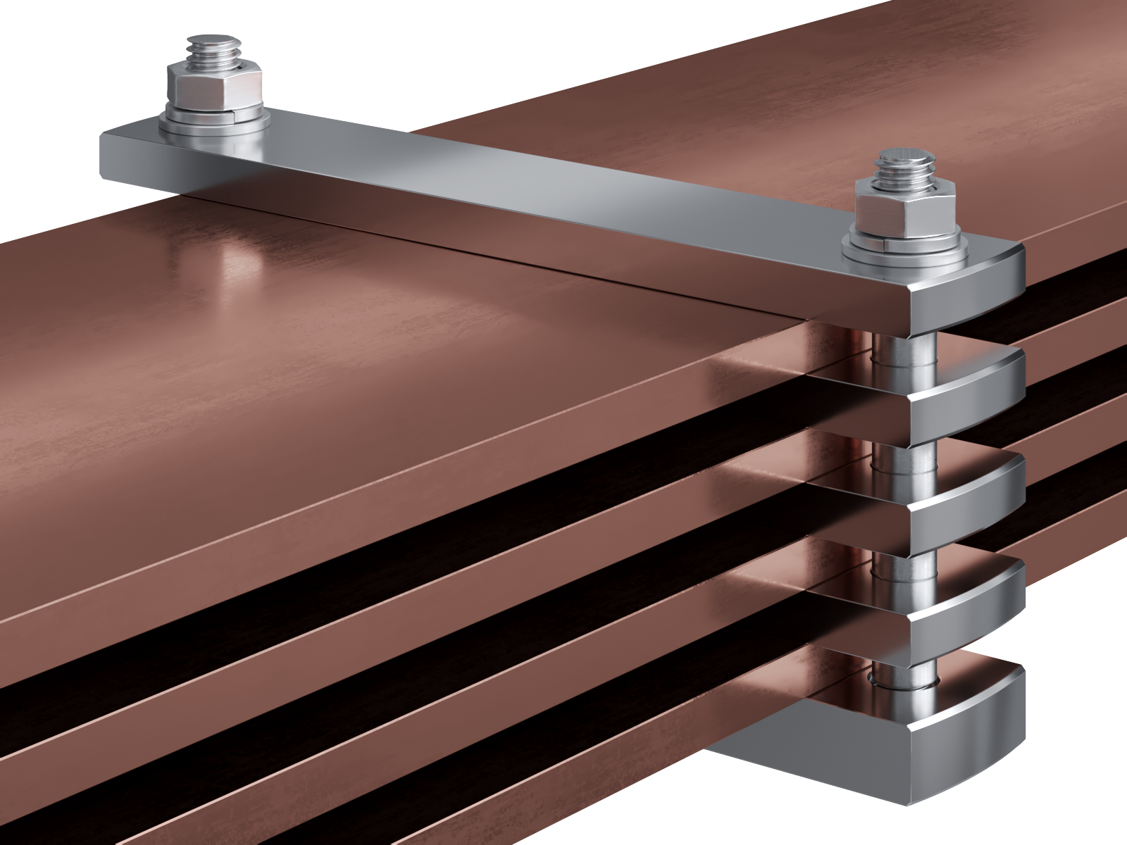 Schienenträger aus vernickeltem Messing zur Befestigung und Sicherung von Stromschienen aus Kupfer