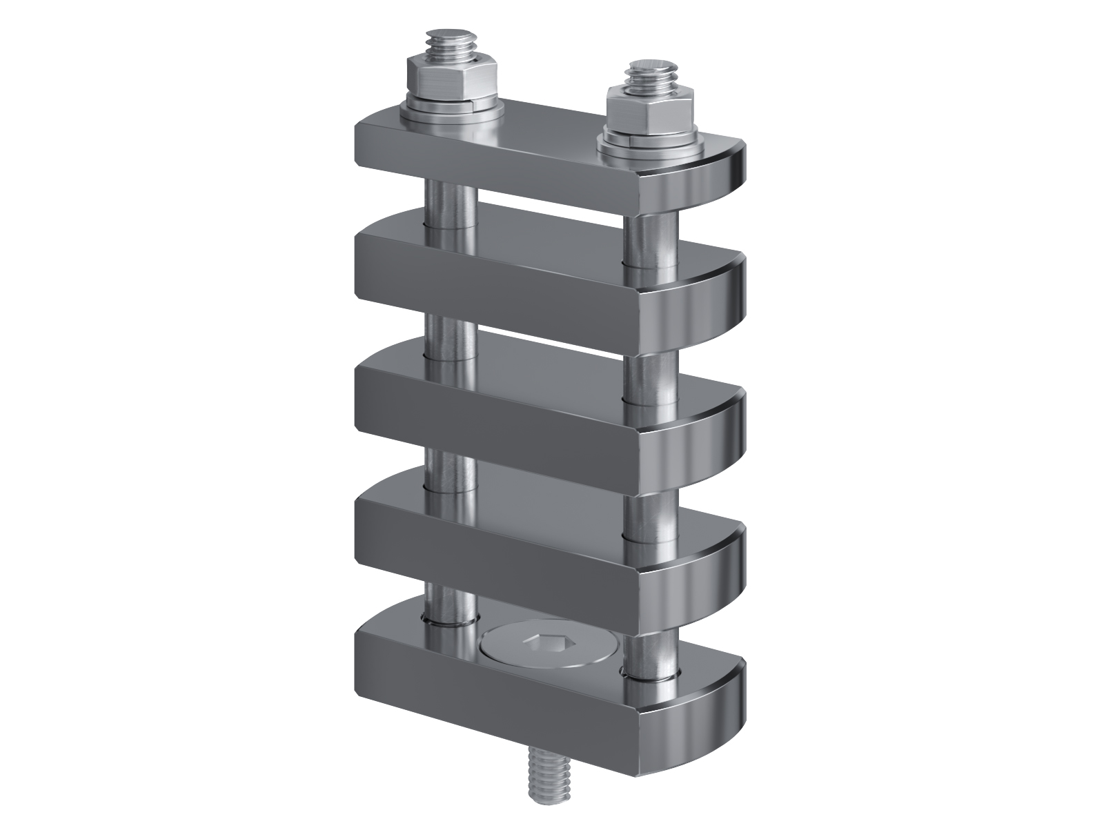 Schienenträger aus vernickeltem Messing zur Befestigung und Sicherung von Stromschienen aus Kupfer