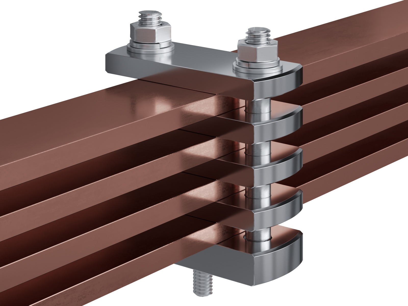 Schienenträger aus vernickeltem Messing zur Befestigung und Sicherung von Stromschienen aus Kupfer