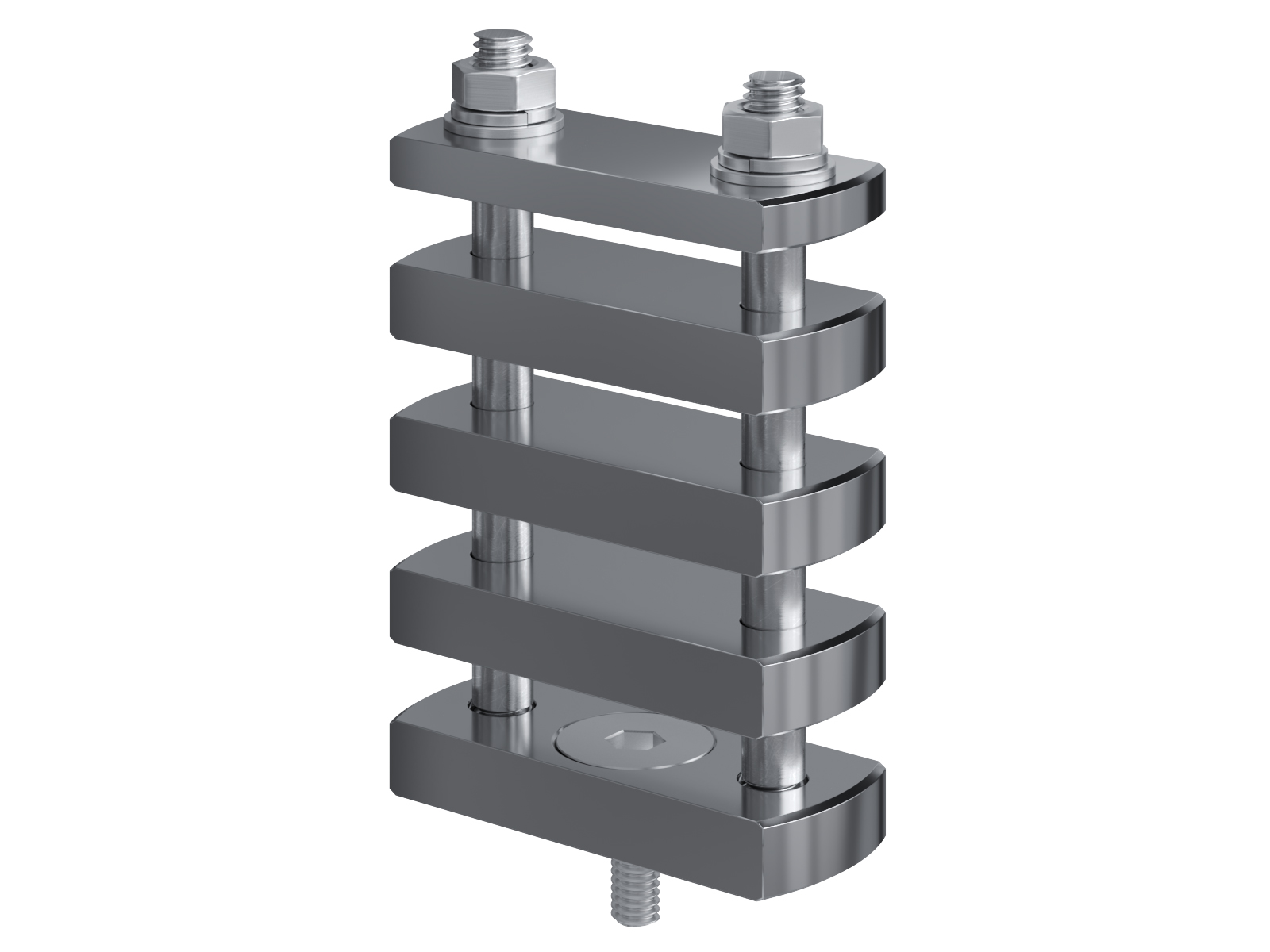 Schienenträger aus vernickeltem Messing zur Befestigung und Sicherung von Stromschienen aus Kupfer