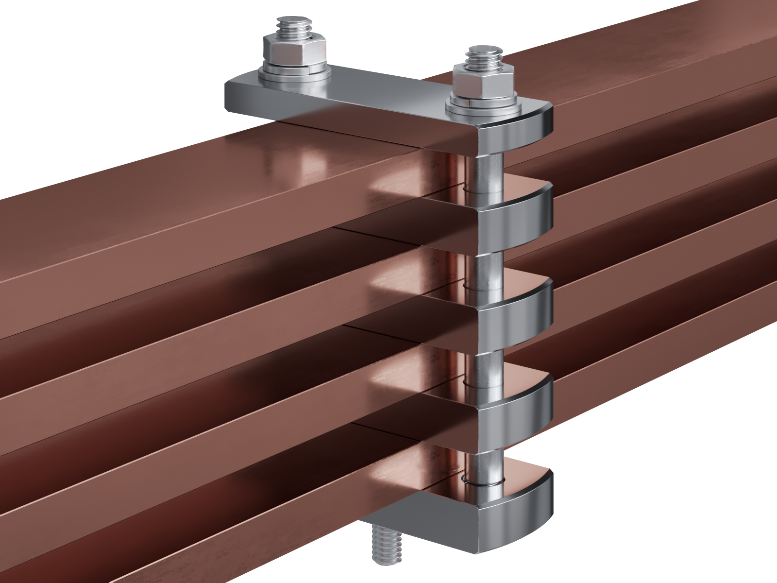 Schienenträger aus vernickeltem Messing zur Befestigung und Sicherung von Stromschienen aus Kupfer