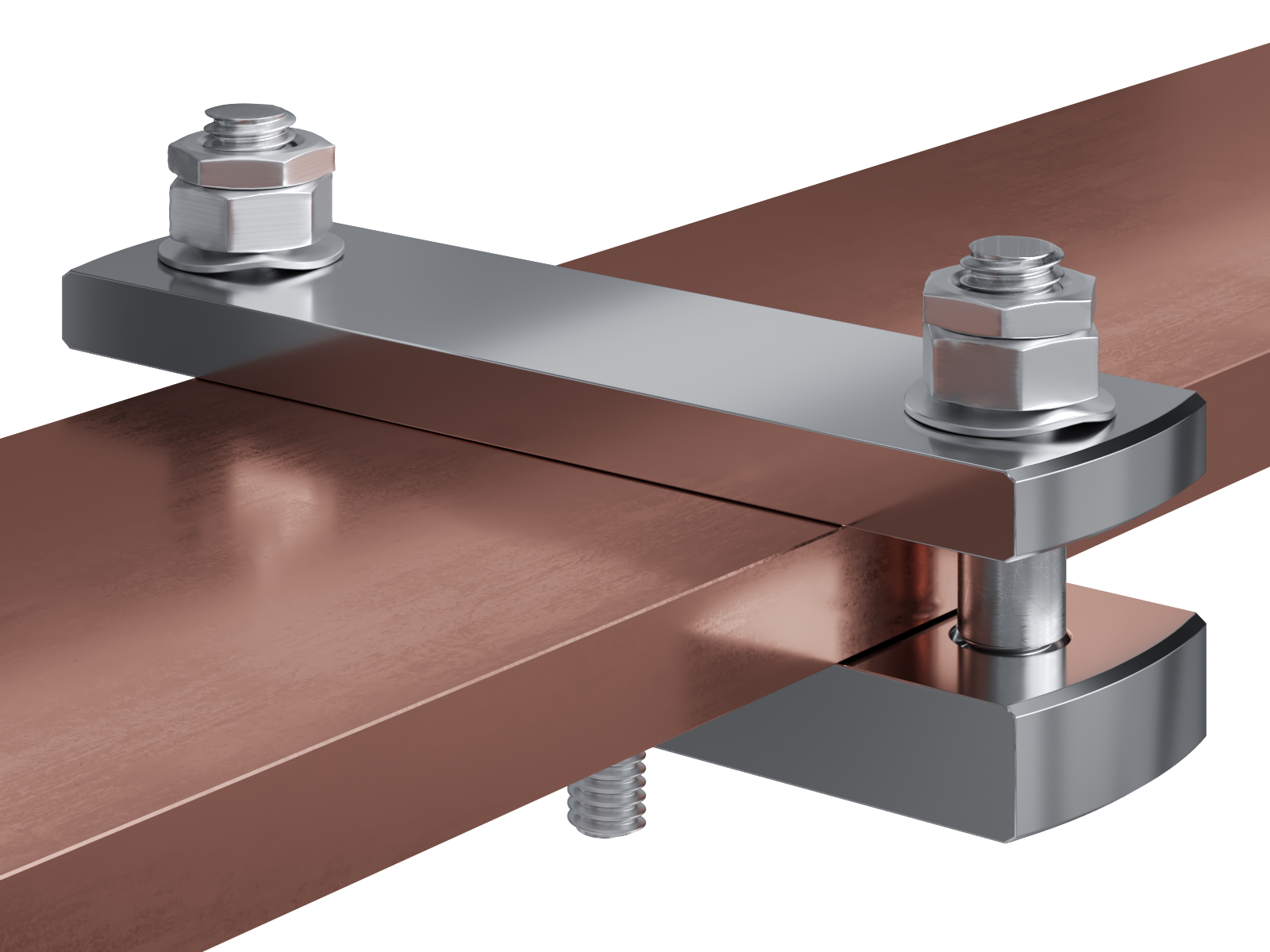 Schienenträger aus vernickeltem Messing zur Befestigung und Sicherung von Stromschienen aus Kupfer