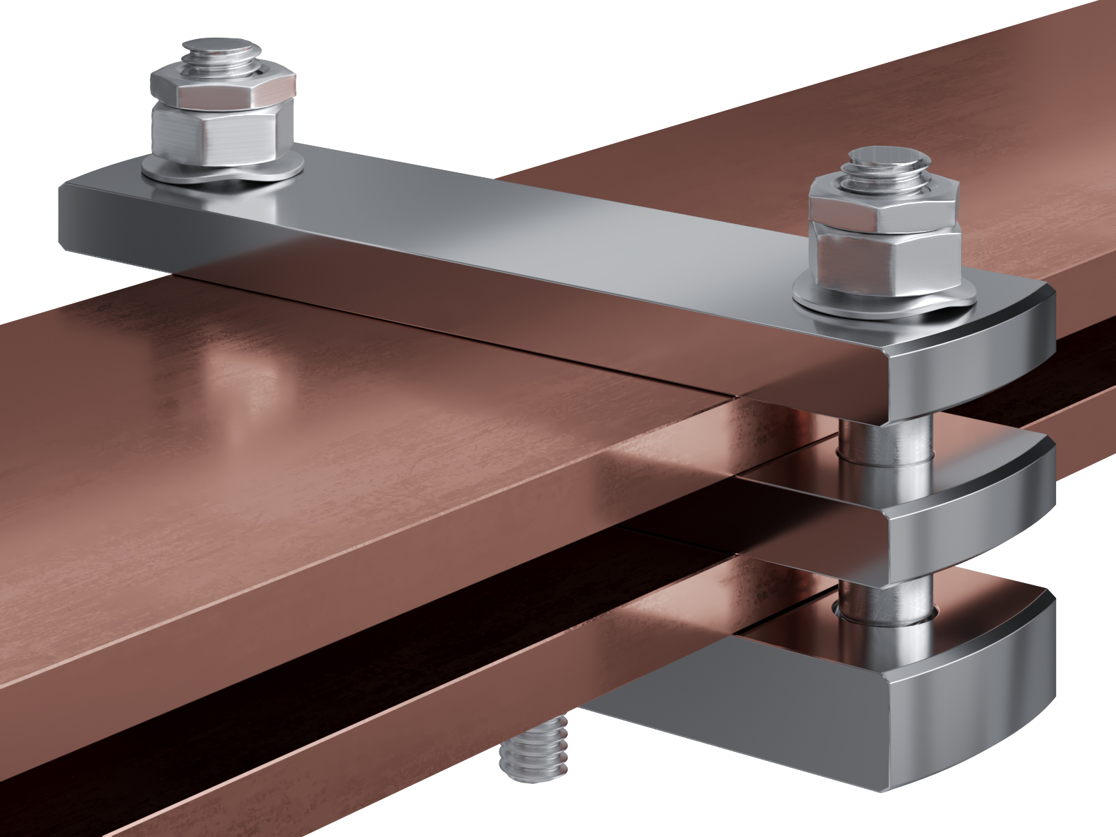 Schienenträger aus vernickeltem Messing zur Befestigung und Sicherung von Stromschienen aus Kupfer