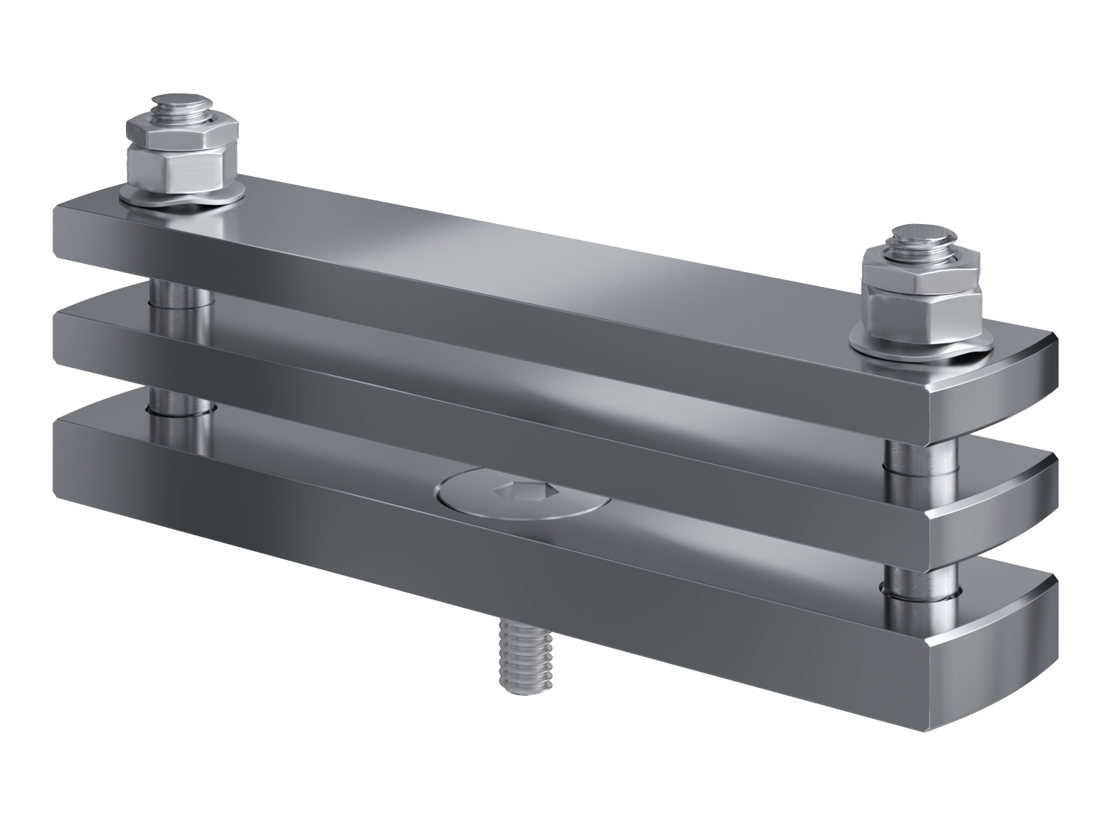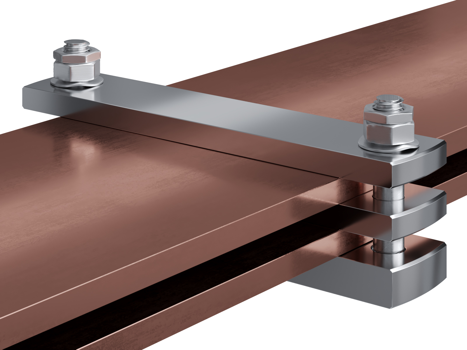 Schienenträger aus vernickeltem Messing zur Befestigung und Sicherung von Stromschienen aus Kupfer