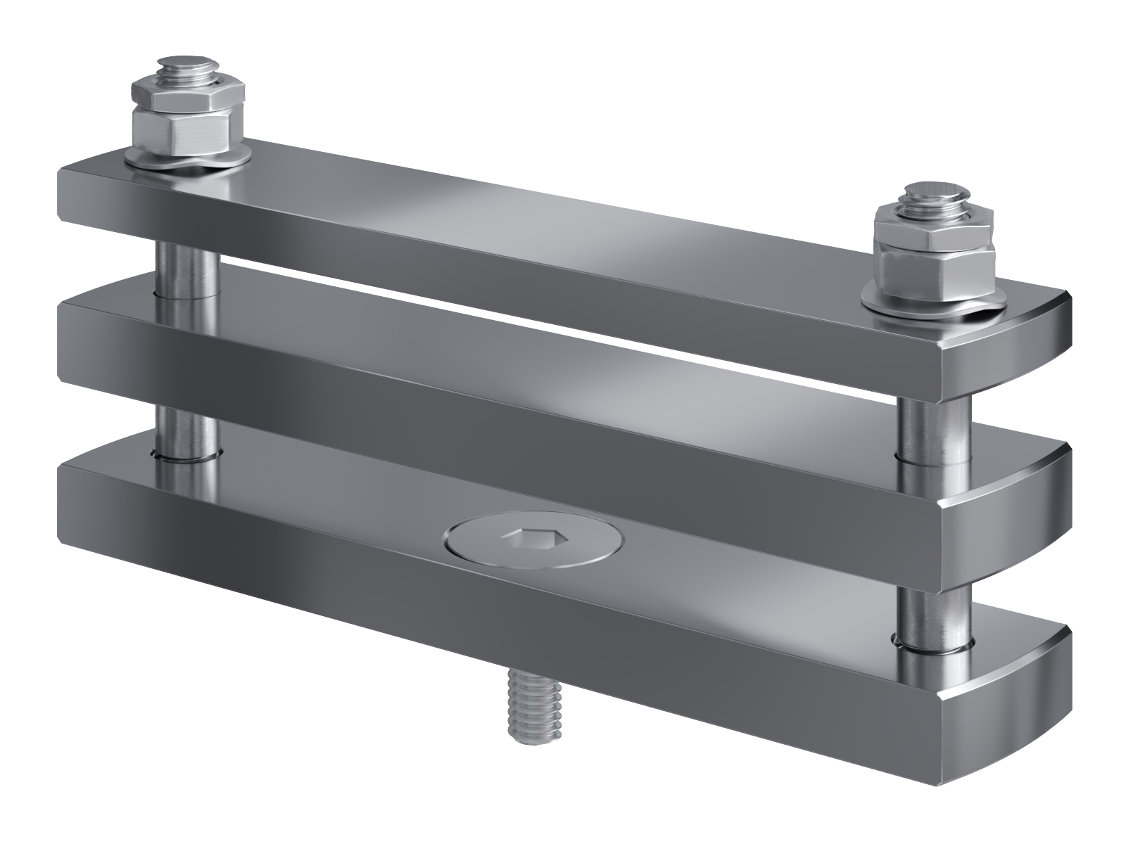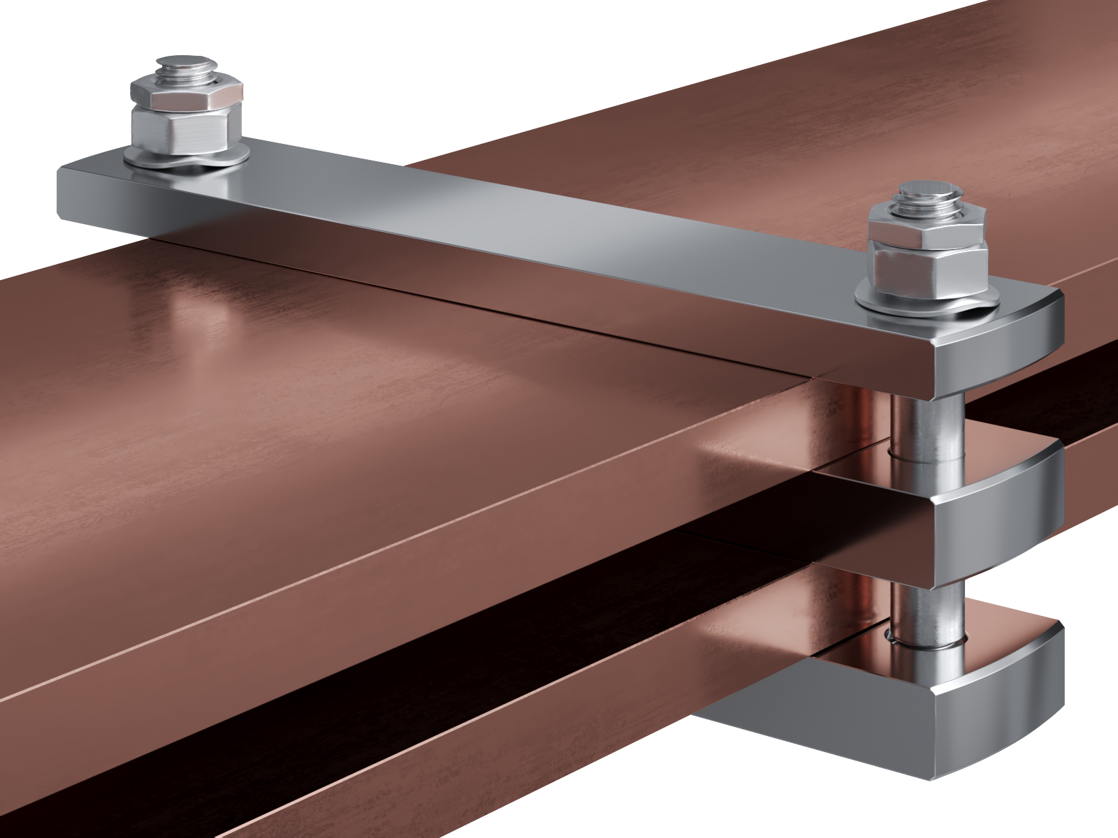 Schienenträger aus vernickeltem Messing zur Befestigung und Sicherung von Stromschienen aus Kupfer