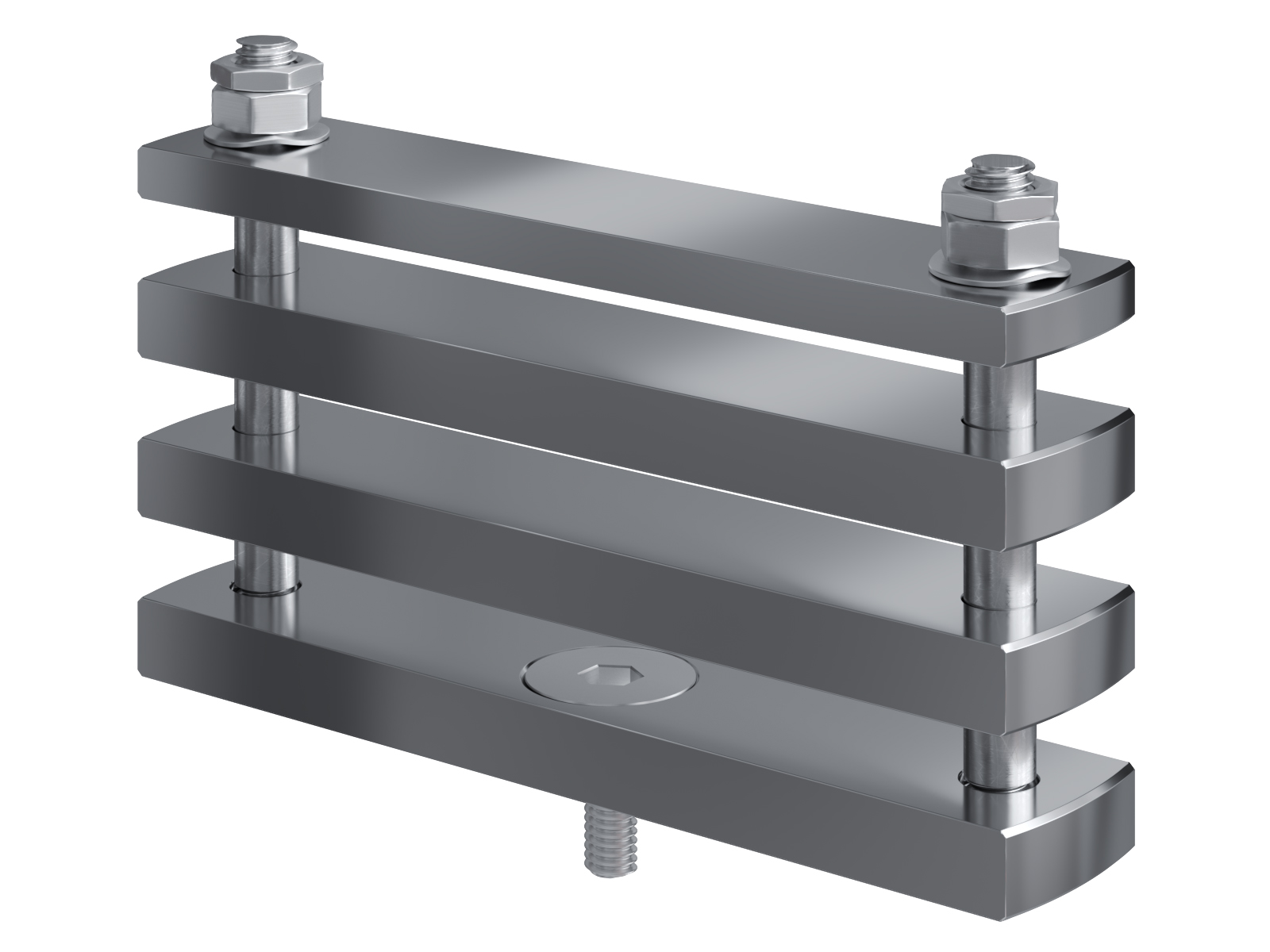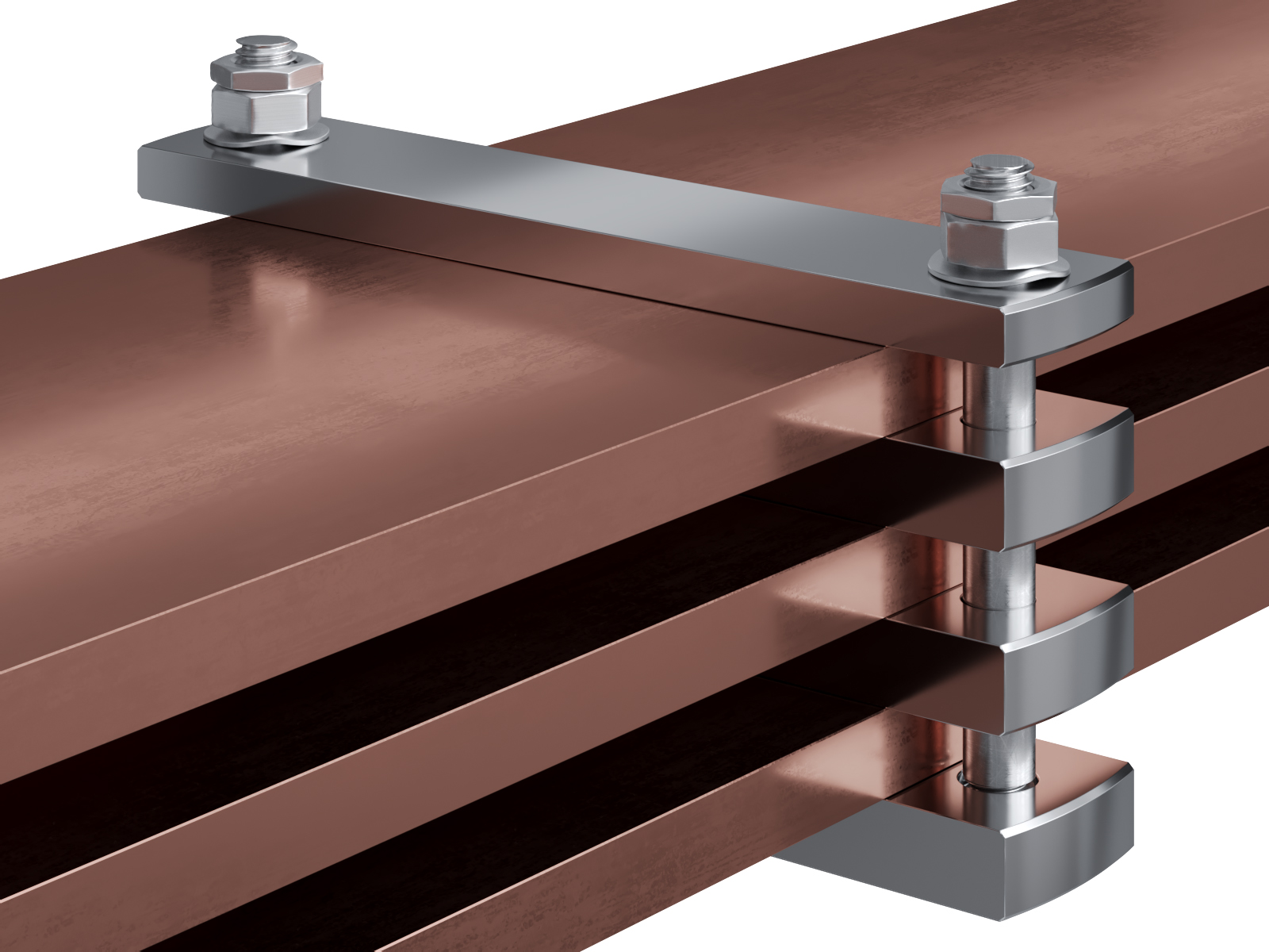 Schienenträger aus vernickeltem Messing zur Befestigung und Sicherung von Stromschienen aus Kupfer