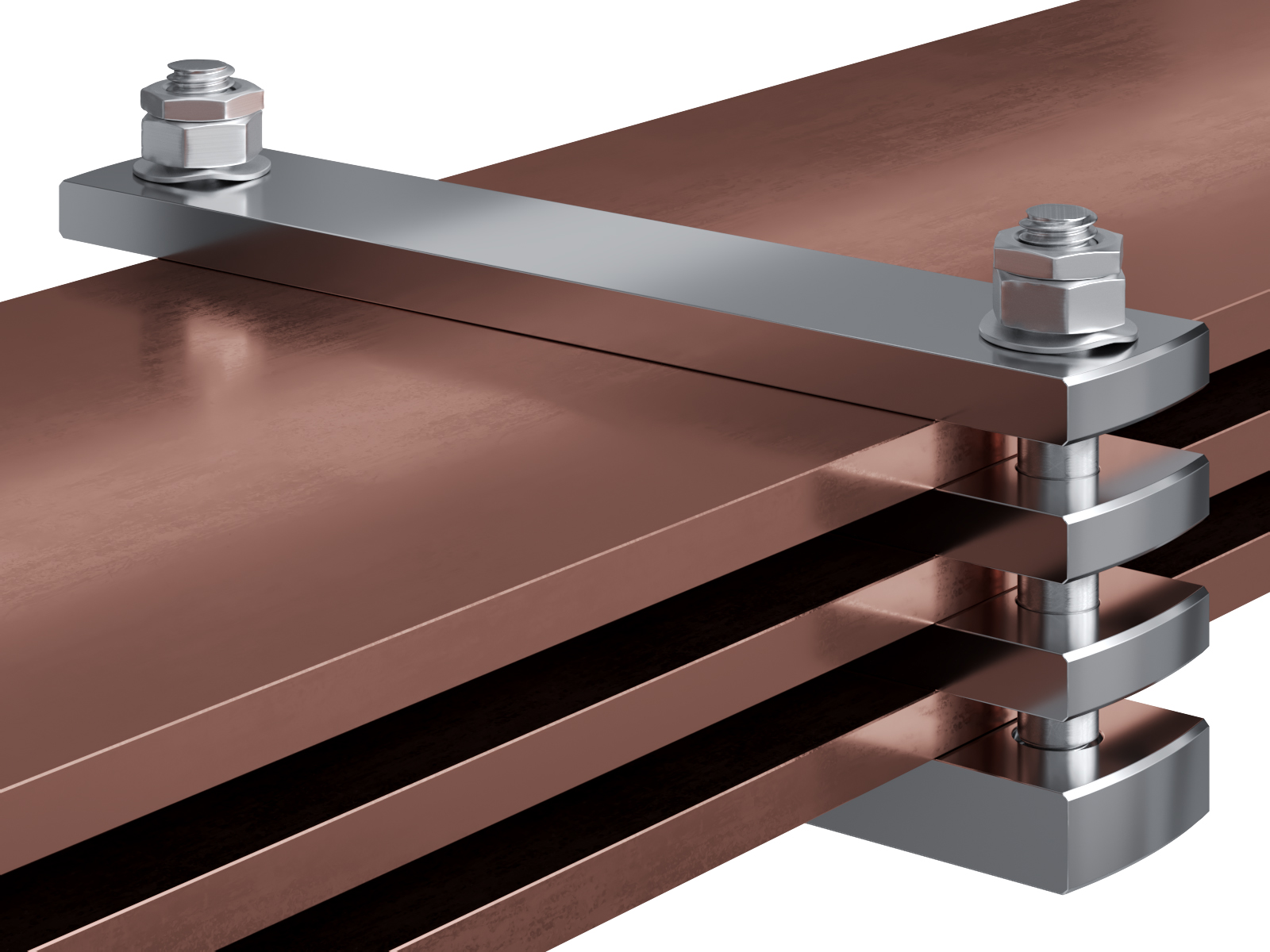 Schienenträger aus vernickeltem Messing zur Befestigung und Sicherung von Stromschienen aus Kupfer