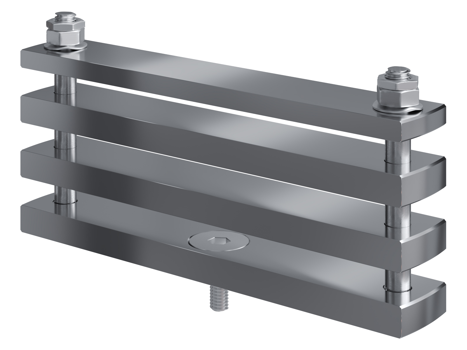 Schienenträger aus vernickeltem Messing zur Befestigung und Sicherung von Stromschienen aus Kupfer