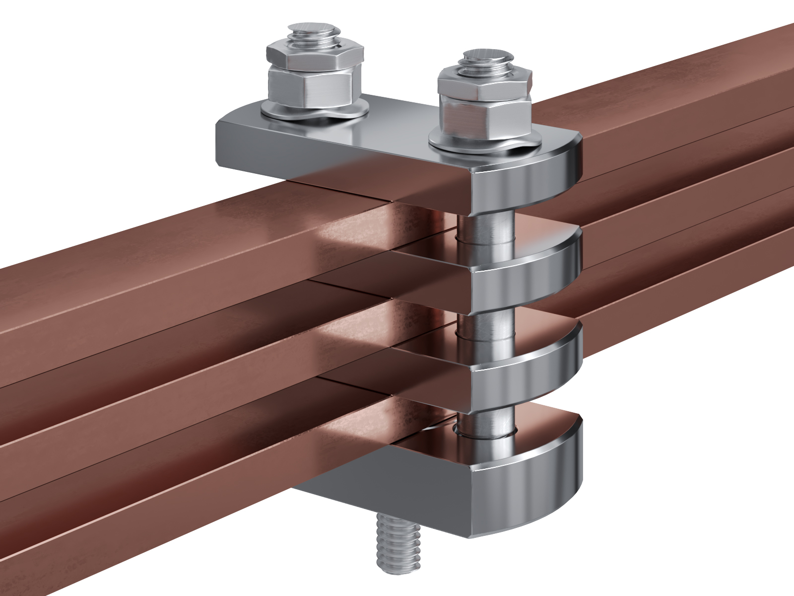 Schienenträger aus vernickeltem Messing zur Befestigung und Sicherung von Stromschienen aus Kupfer