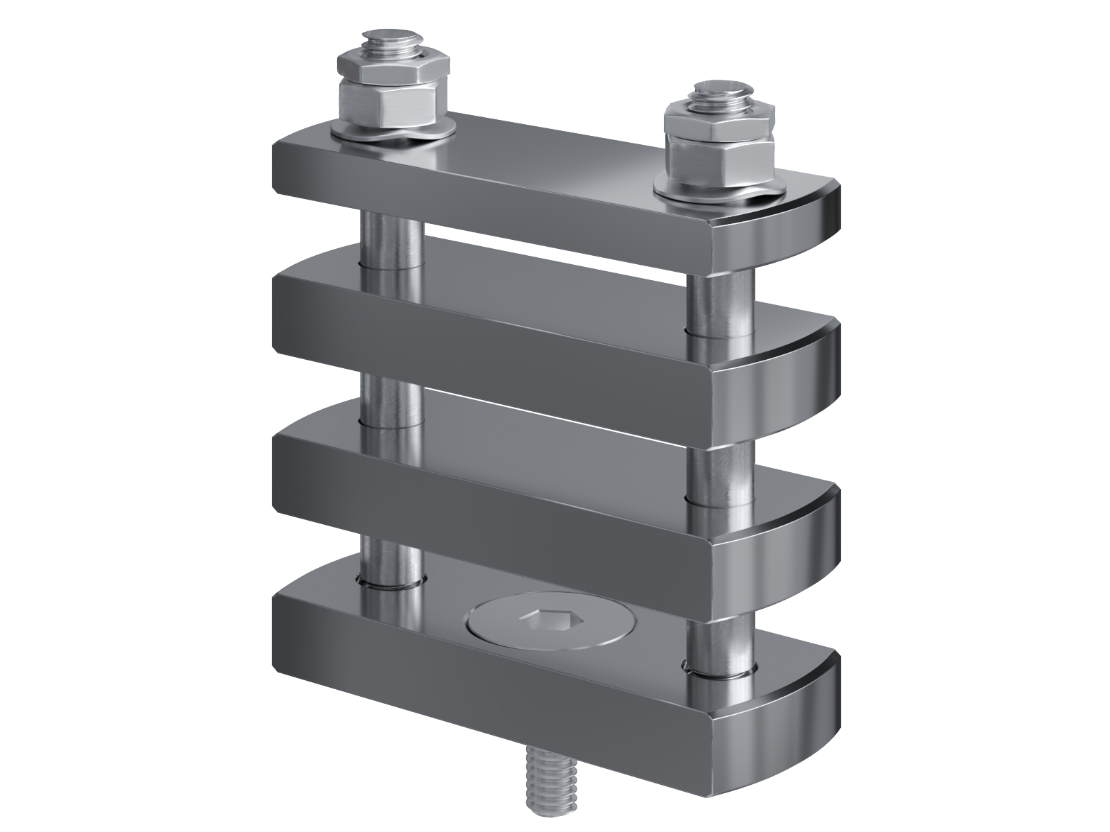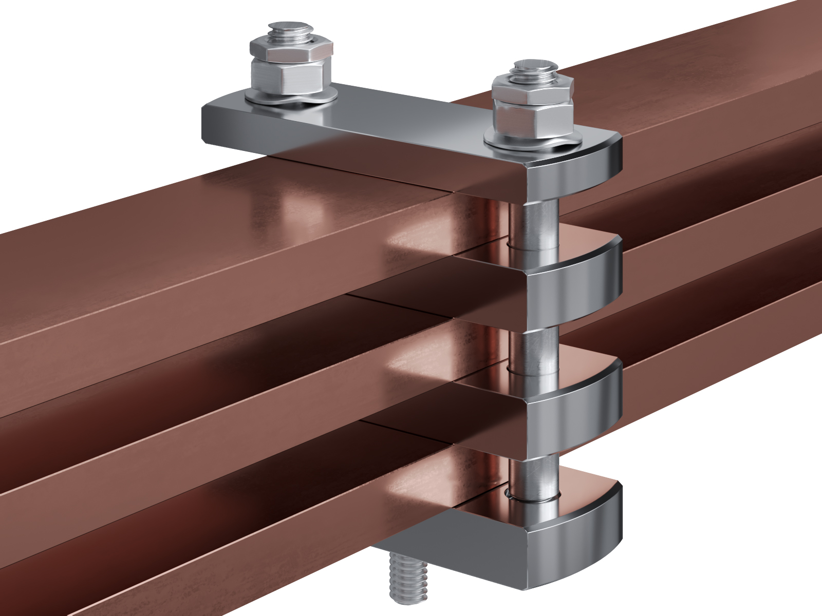 Schienenträger aus vernickeltem Messing zur Befestigung und Sicherung von Stromschienen aus Kupfer