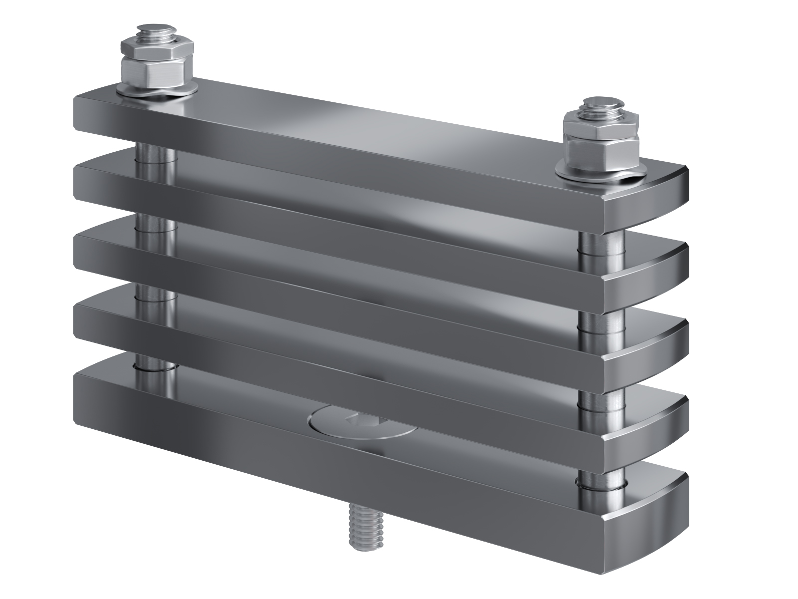 Schienenträger aus vernickeltem Messing zur Befestigung und Sicherung von Stromschienen aus Kupfer