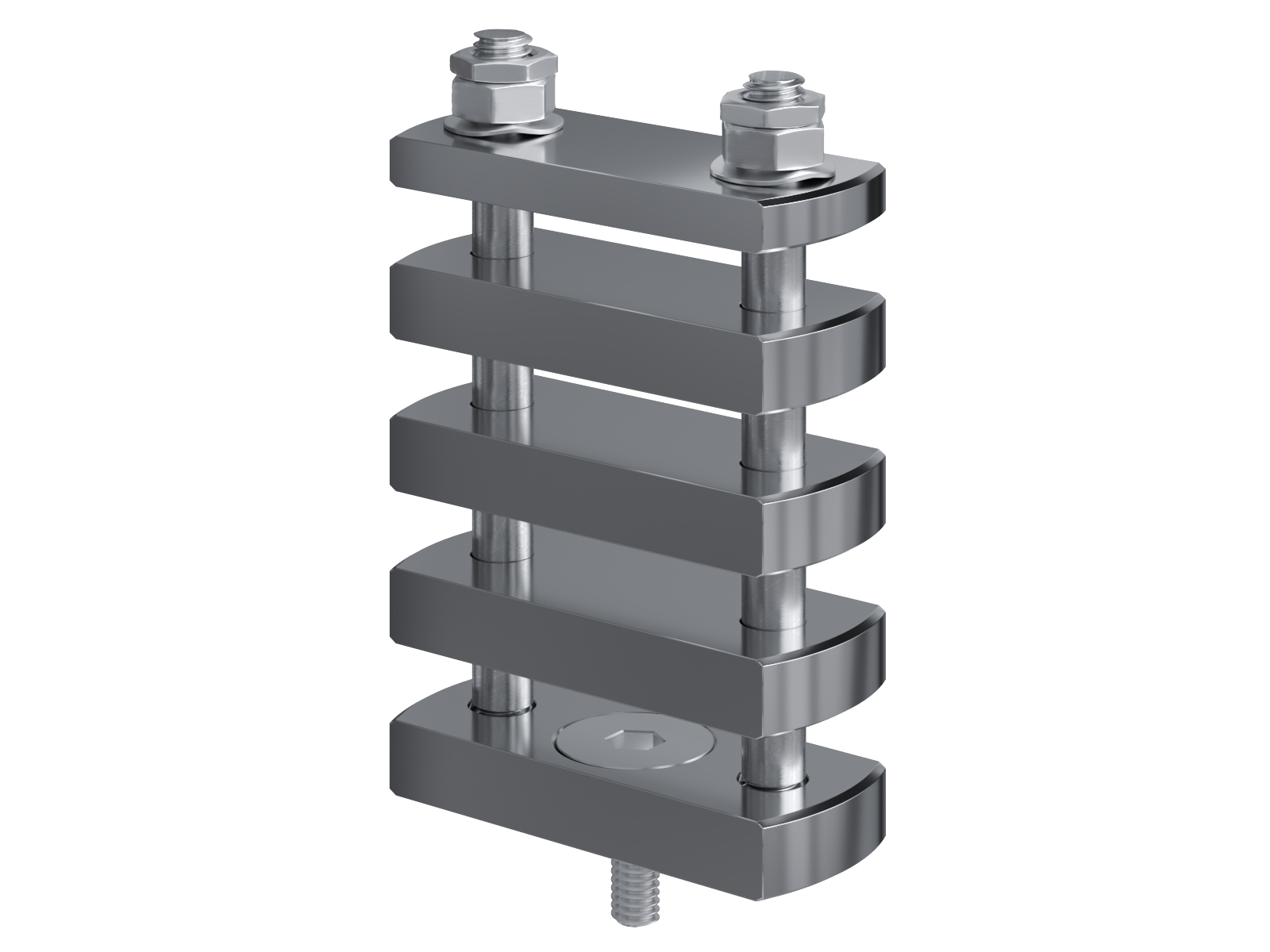 Schienenträger aus vernickeltem Messing zur Befestigung und Sicherung von Stromschienen aus Kupfer