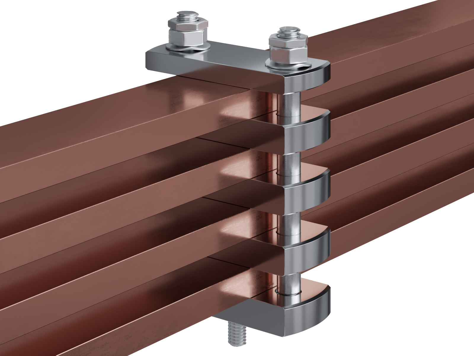 Schienenträger aus vernickeltem Messing zur Befestigung und Sicherung von Stromschienen aus Kupfer