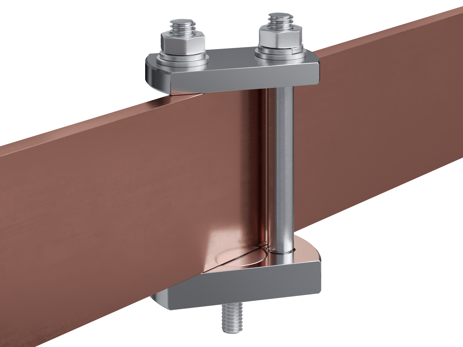 Schienenträger aus vernickeltem Messing zur Befestigung und Sicherung von Stromschienen aus Kupfer