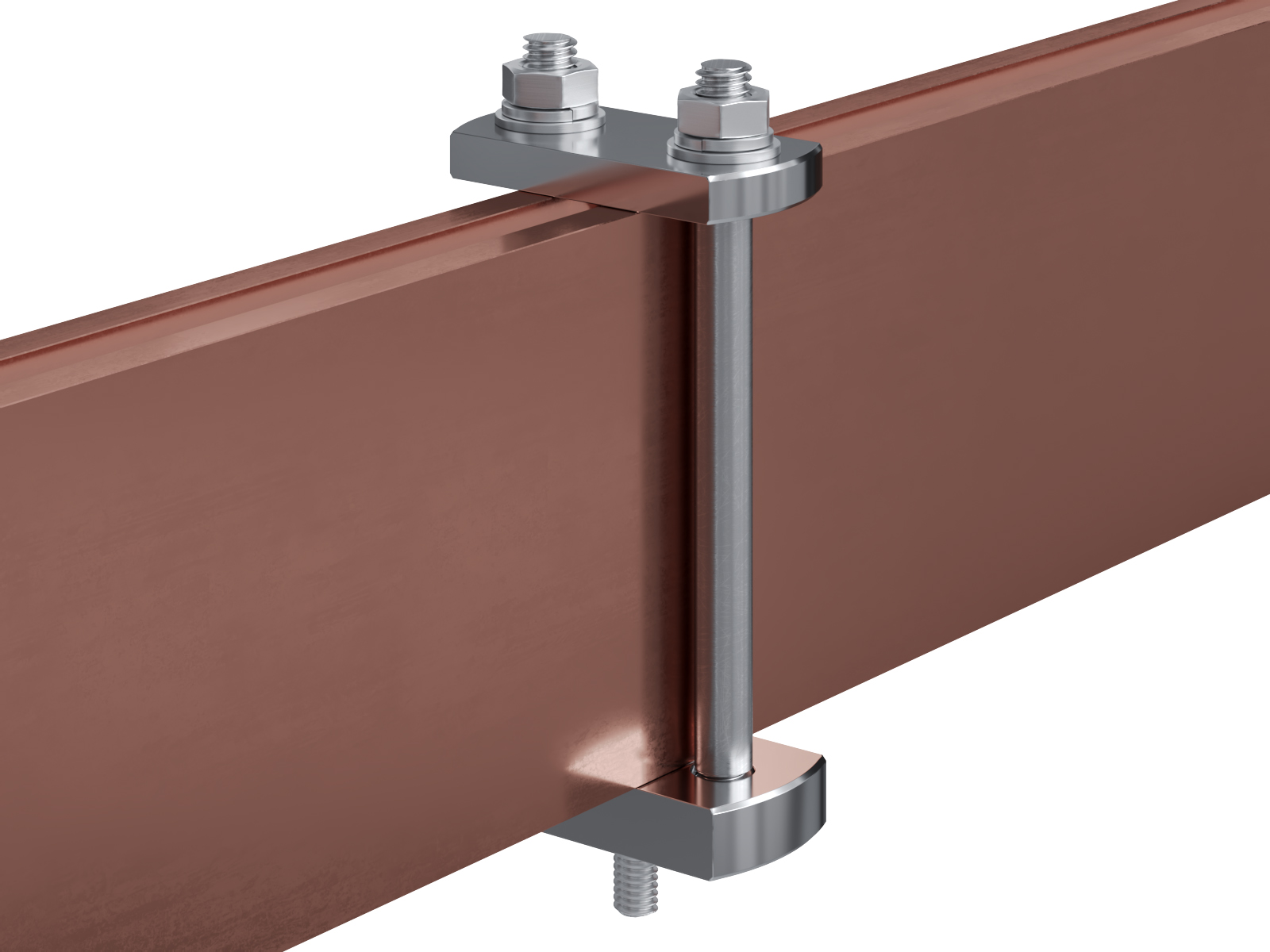Schienenträger aus vernickeltem Messing zur Befestigung und Sicherung von Stromschienen aus Kupfer