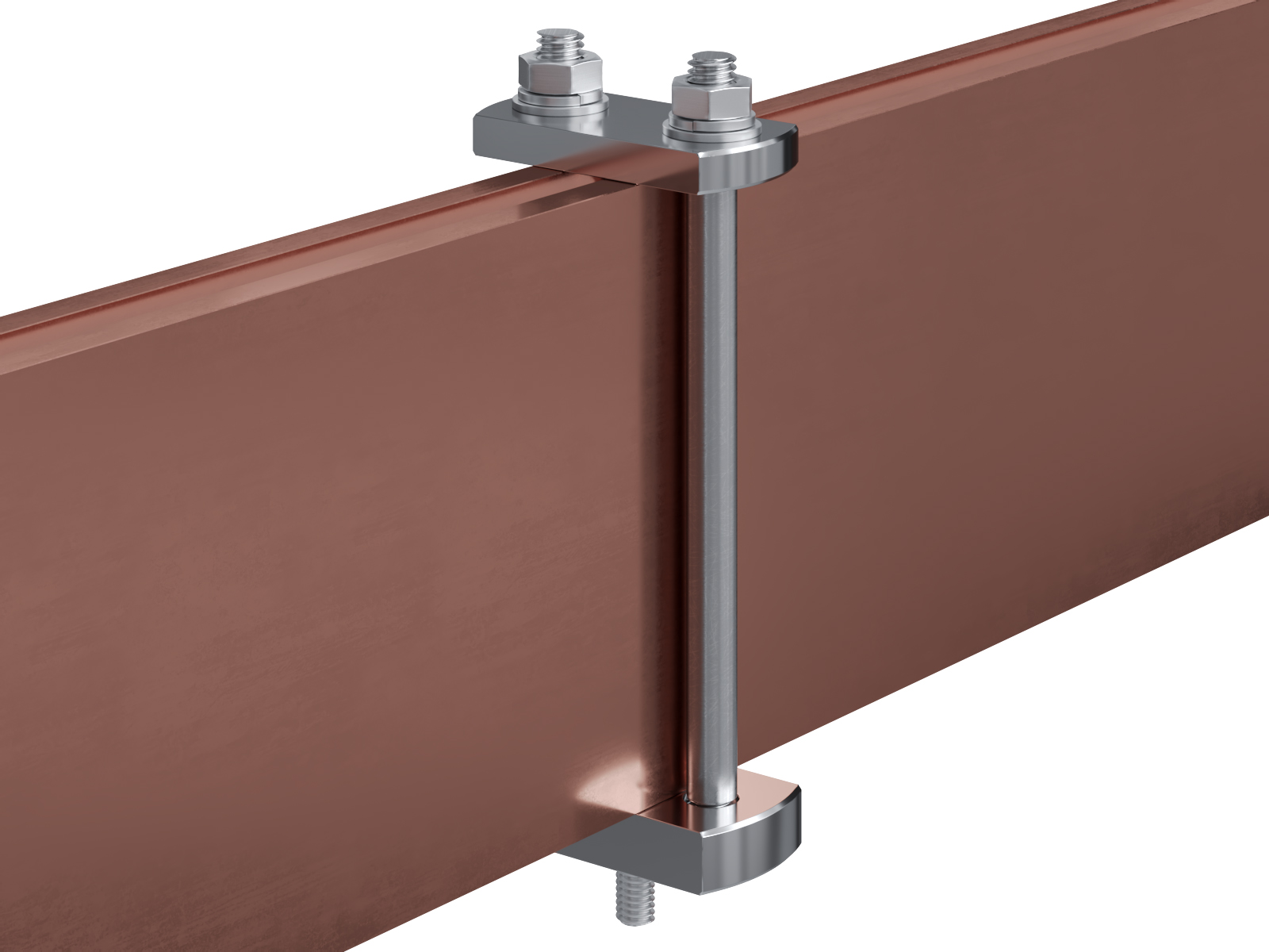 Schienenträger aus vernickeltem Messing zur Befestigung und Sicherung von Stromschienen aus Kupfer