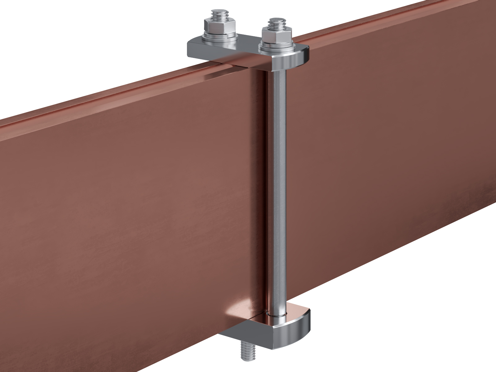 Schienenträger aus vernickeltem Messing zur Befestigung und Sicherung von Stromschienen aus Kupfer
