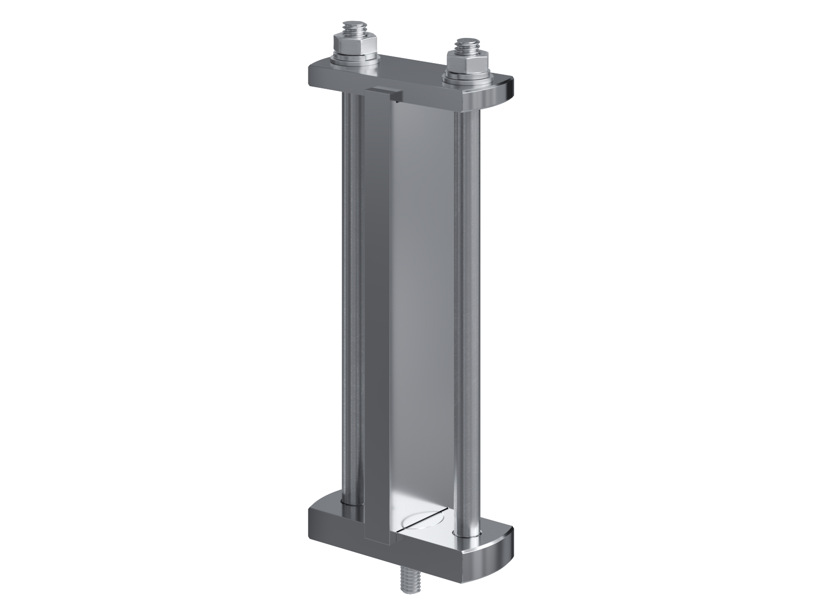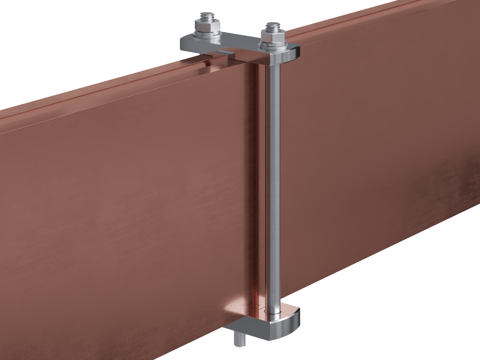 Schienenträger aus vernickeltem Messing zur Befestigung und Sicherung von Stromschienen aus Kupfer