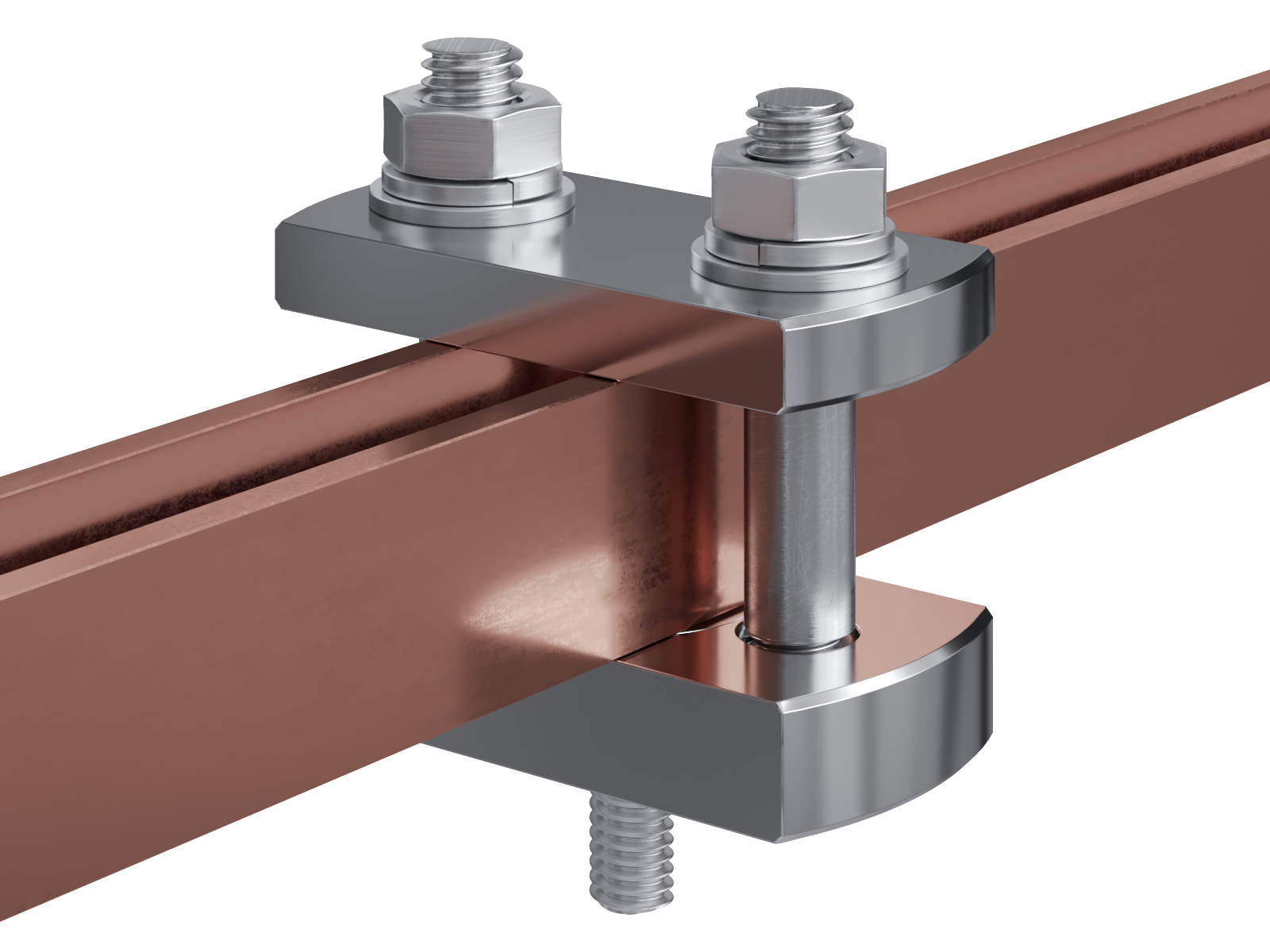 Schienenträger aus vernickeltem Messing zur Befestigung und Sicherung von Stromschienen aus Kupfer