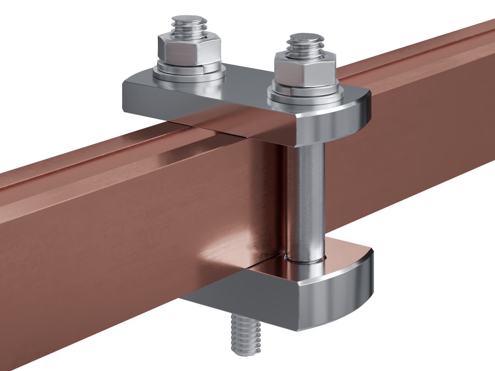 Schienenträger aus vernickeltem Messing zur Befestigung und Sicherung von Stromschienen aus Kupfer