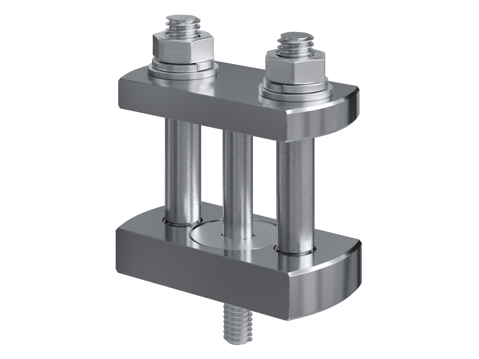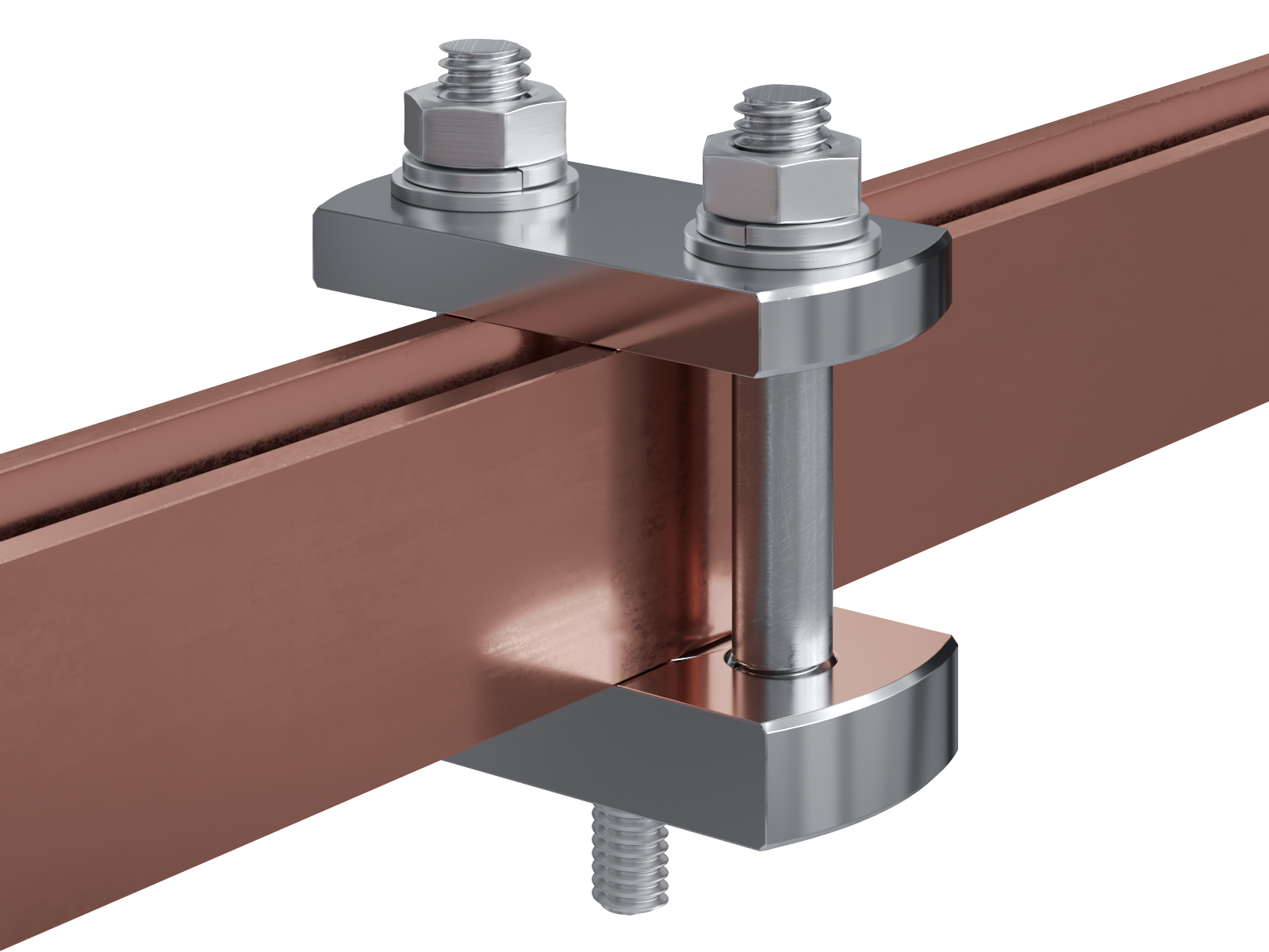 Schienenträger aus vernickeltem Messing zur Befestigung und Sicherung von Stromschienen aus Kupfer