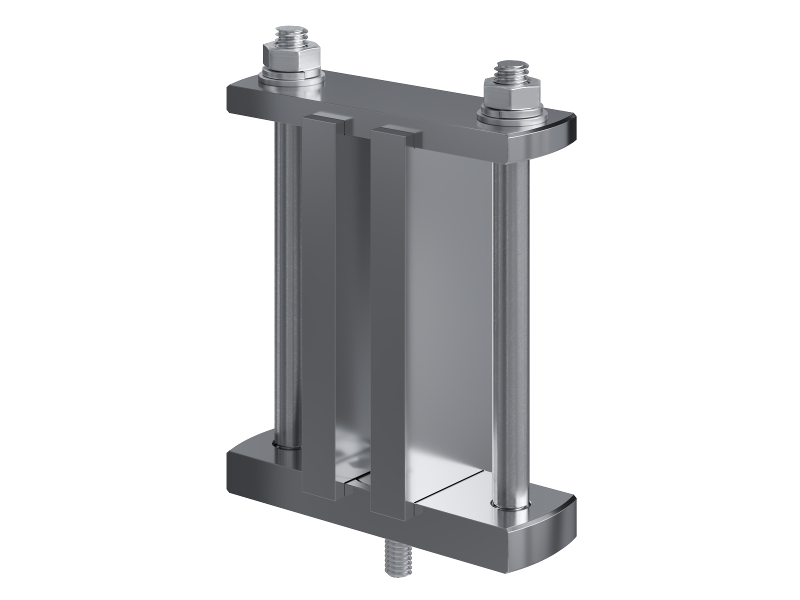 Schienenträger aus vernickeltem Messing zur Befestigung und Sicherung von Stromschienen aus Kupfer