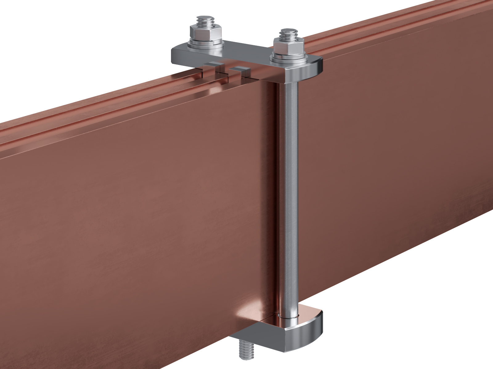 Schienenträger aus vernickeltem Messing zur Befestigung und Sicherung von Stromschienen aus Kupfer