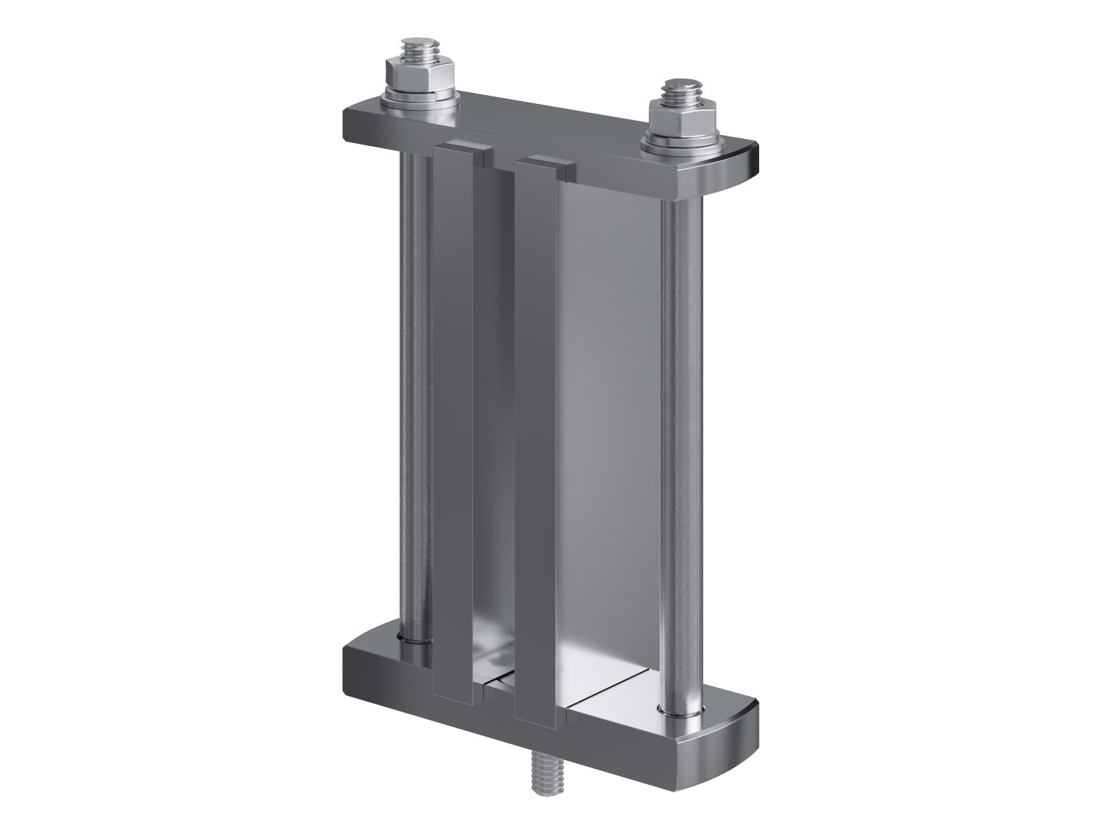 Schienenträger aus vernickeltem Messing zur Befestigung und Sicherung von Stromschienen aus Kupfer