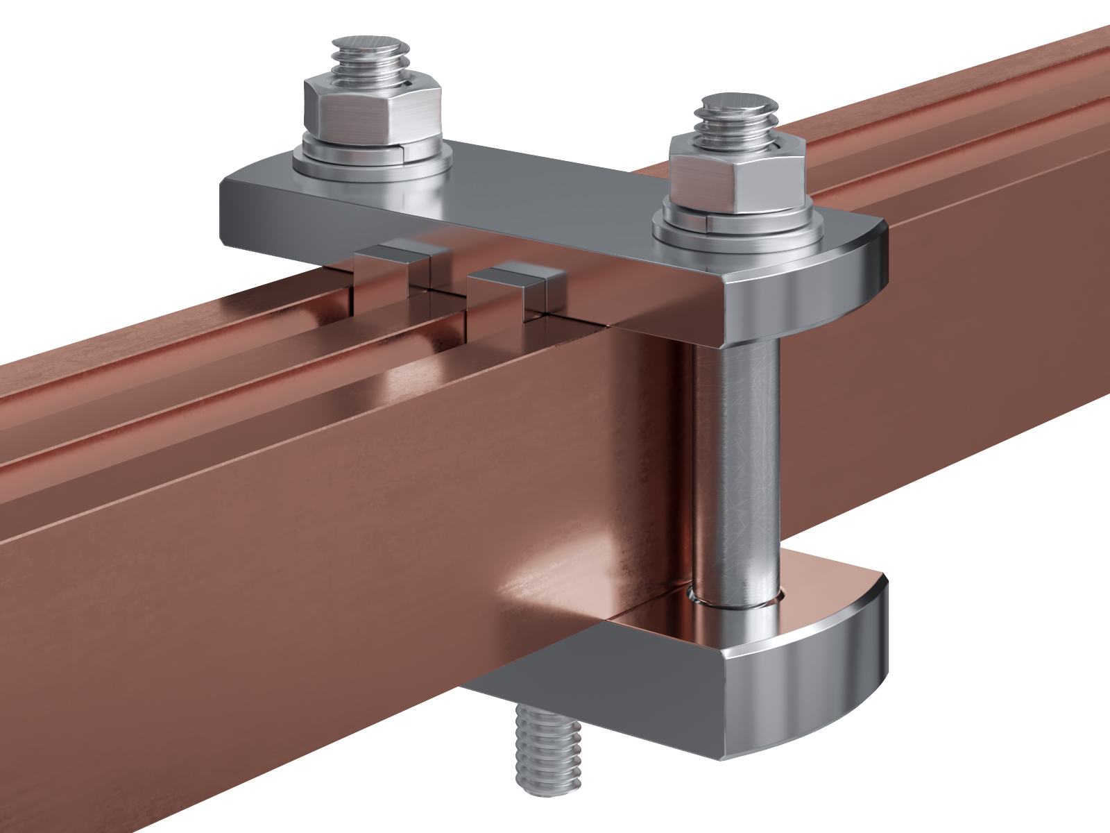 Schienenträger aus vernickeltem Messing zur Befestigung und Sicherung von Stromschienen aus Kupfer