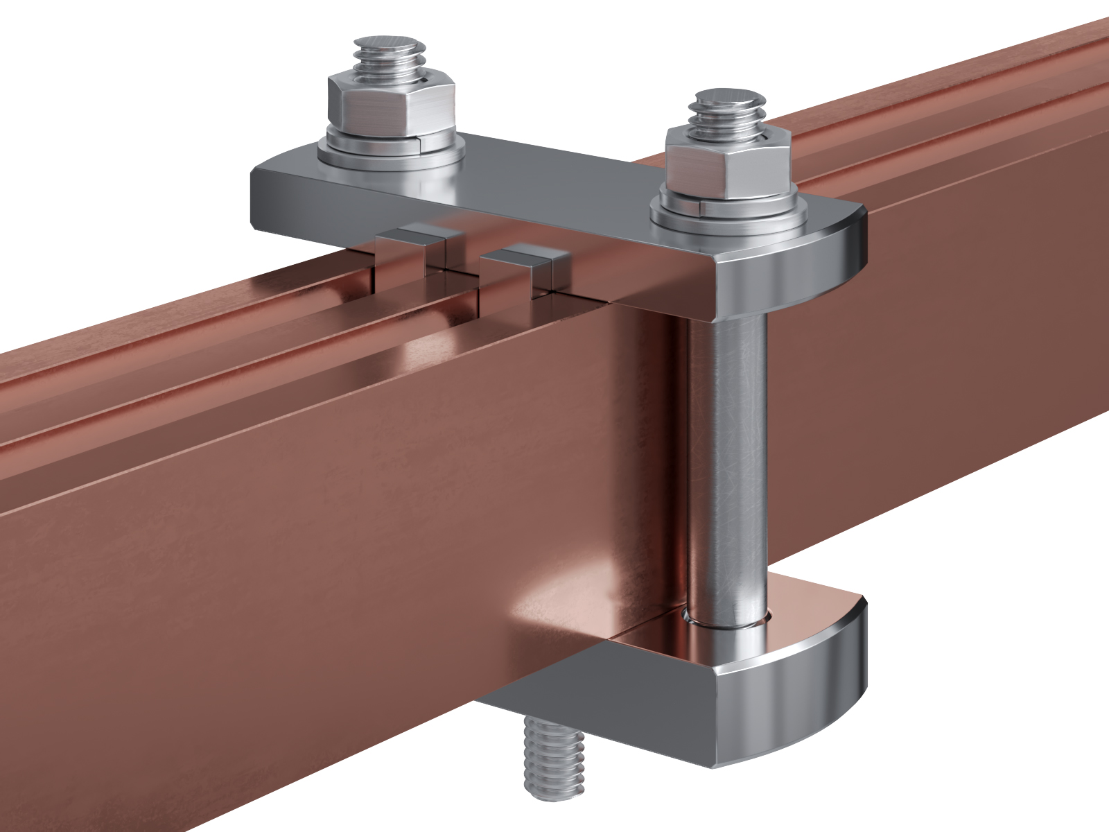 Schienenträger aus vernickeltem Messing zur Befestigung und Sicherung von Stromschienen aus Kupfer