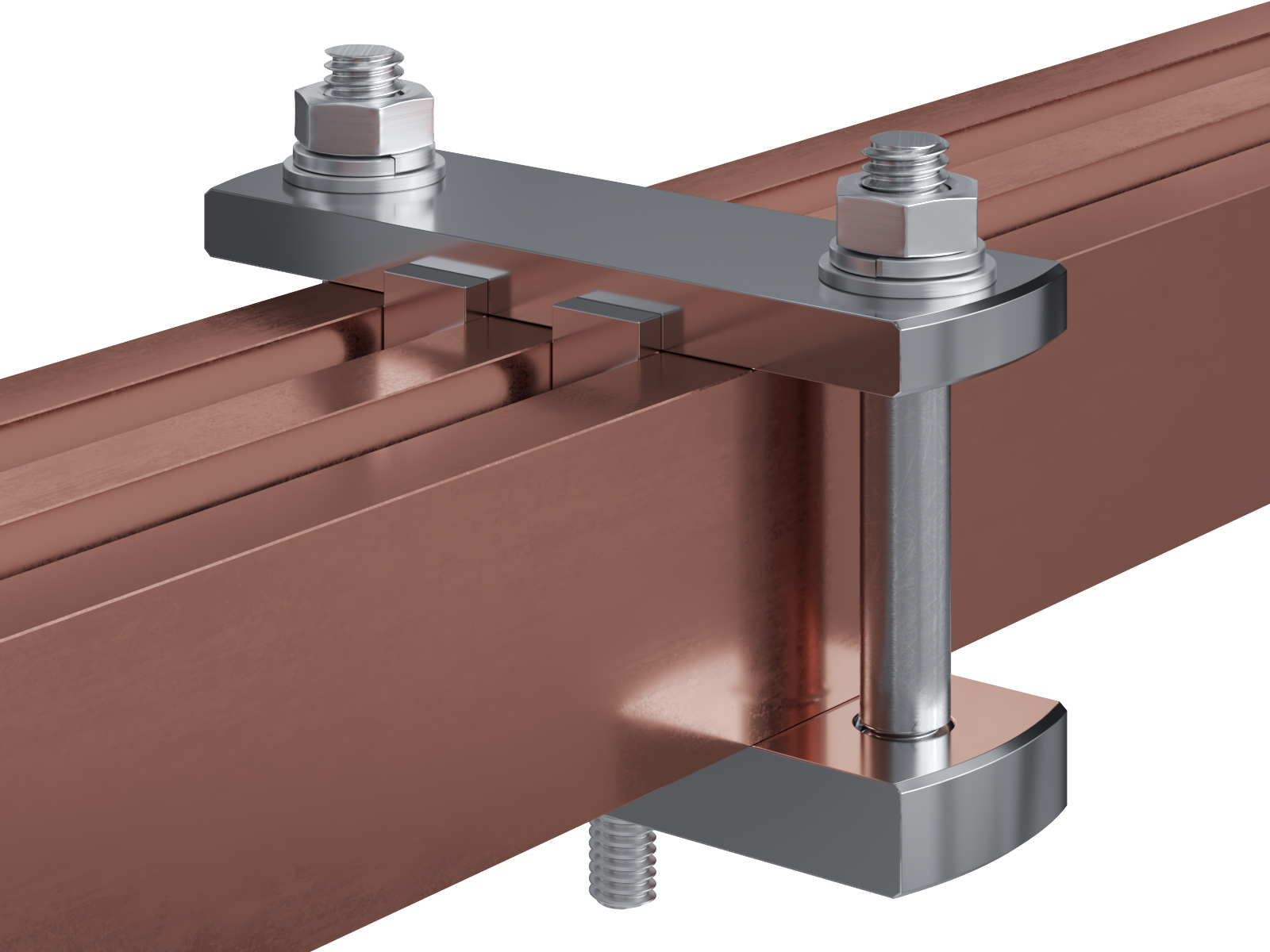 Schienenträger aus vernickeltem Messing zur Befestigung und Sicherung von Stromschienen aus Kupfer