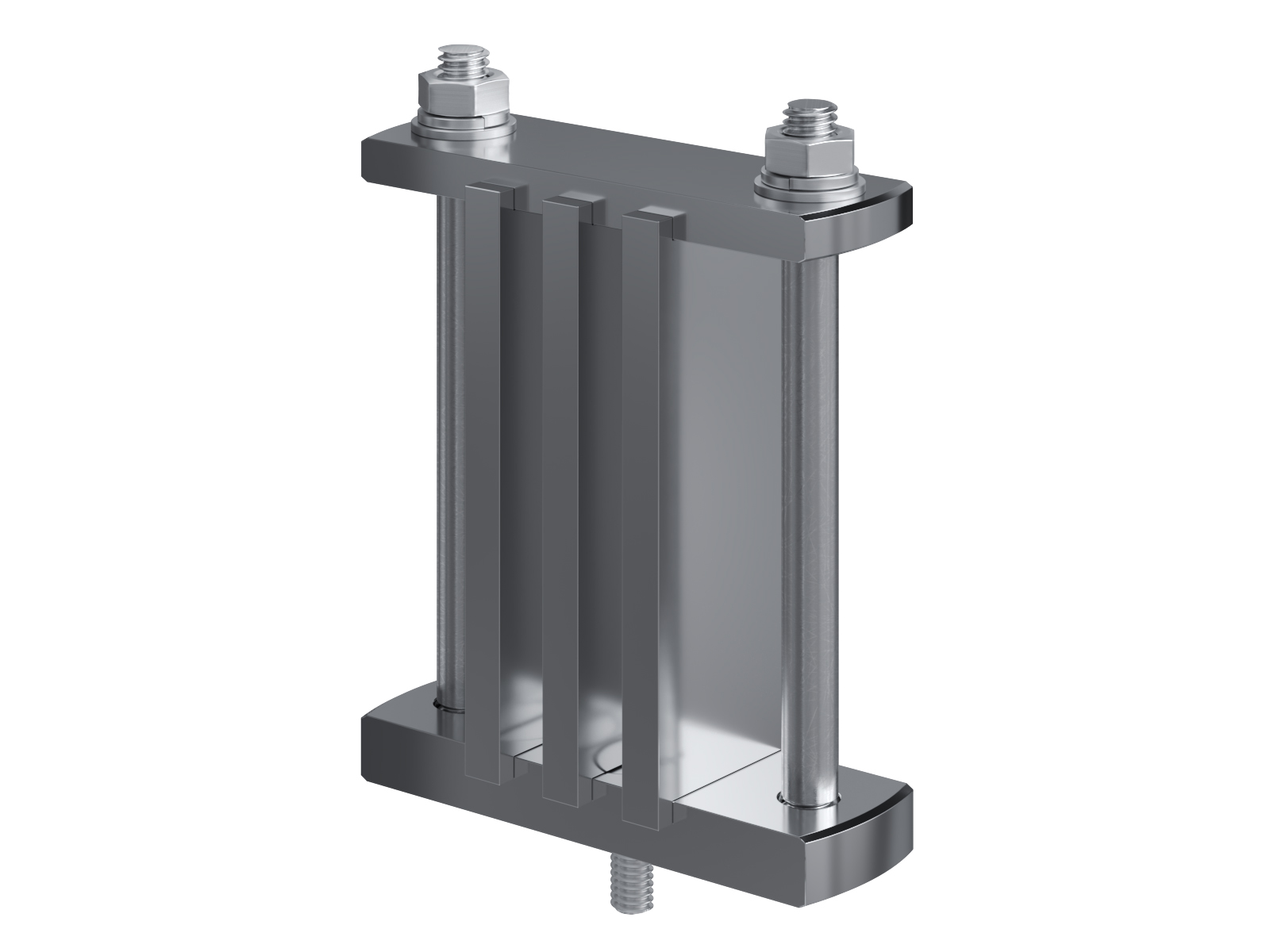 Schienenträger aus vernickeltem Messing zur Befestigung und Sicherung von Stromschienen aus Kupfer