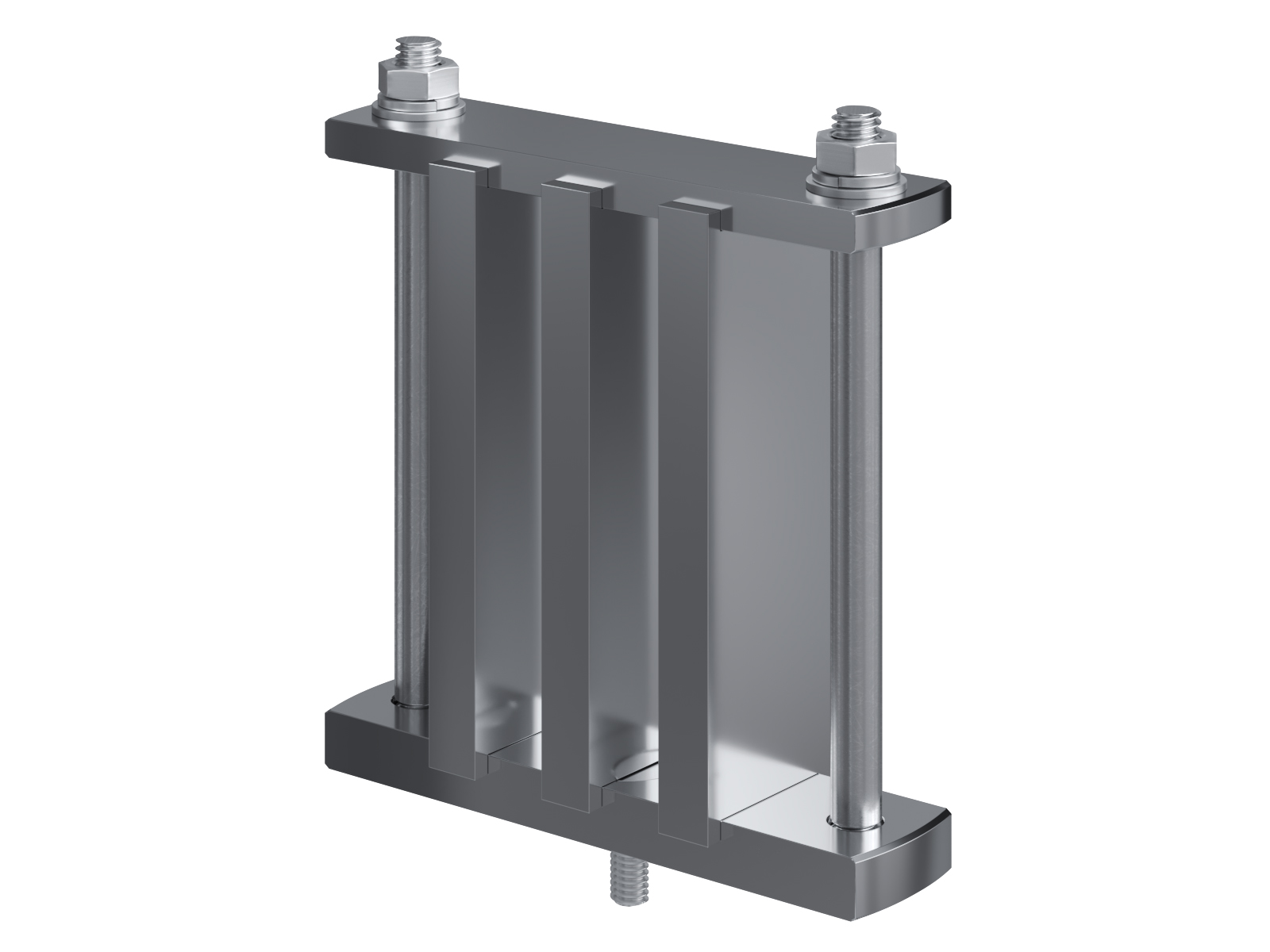 Schienenträger aus vernickeltem Messing zur Befestigung und Sicherung von Stromschienen aus Kupfer