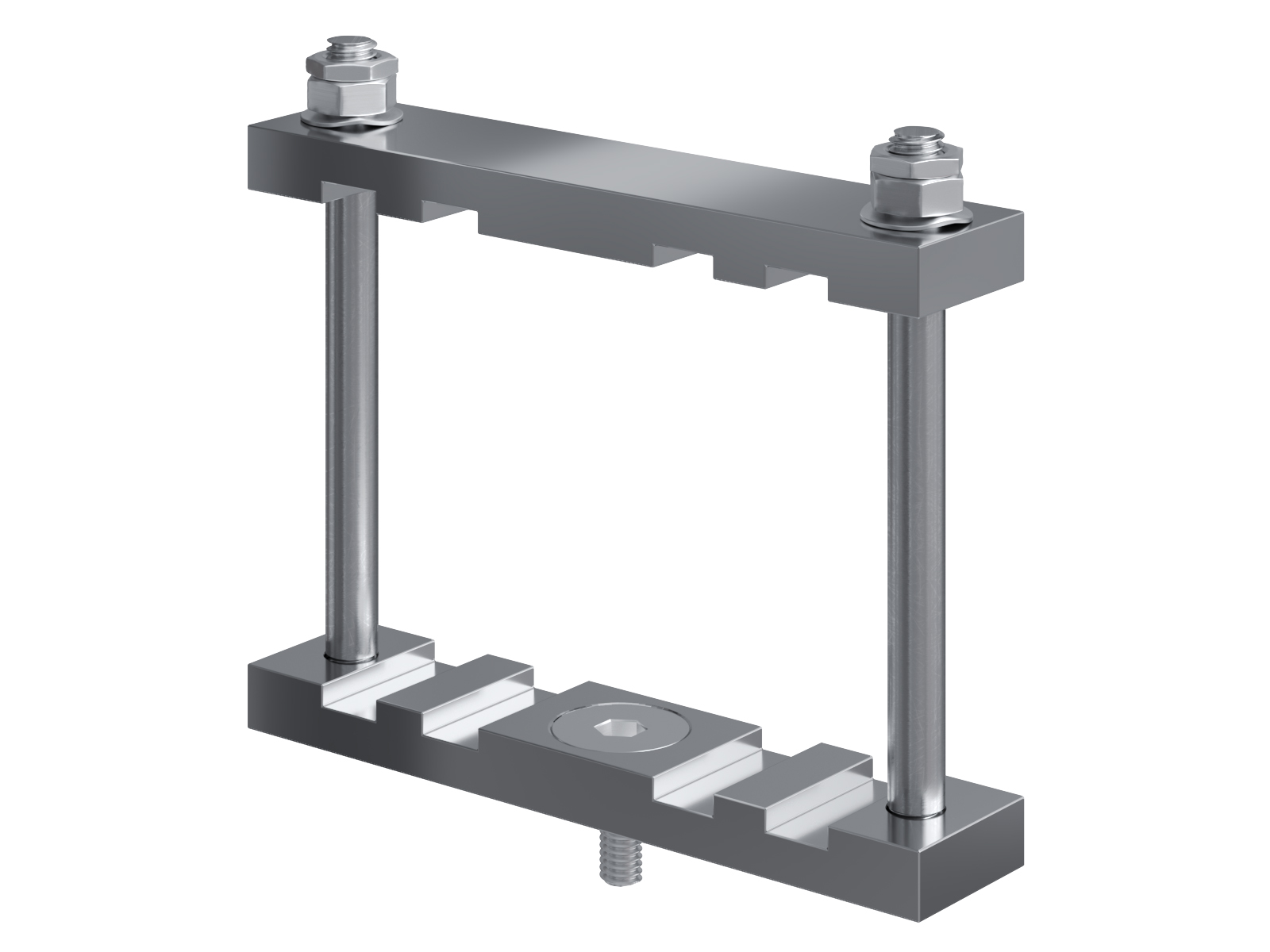 Schienenträger aus vernickeltem Messing zur Befestigung und Sicherung von Stromschienen aus Kupfer