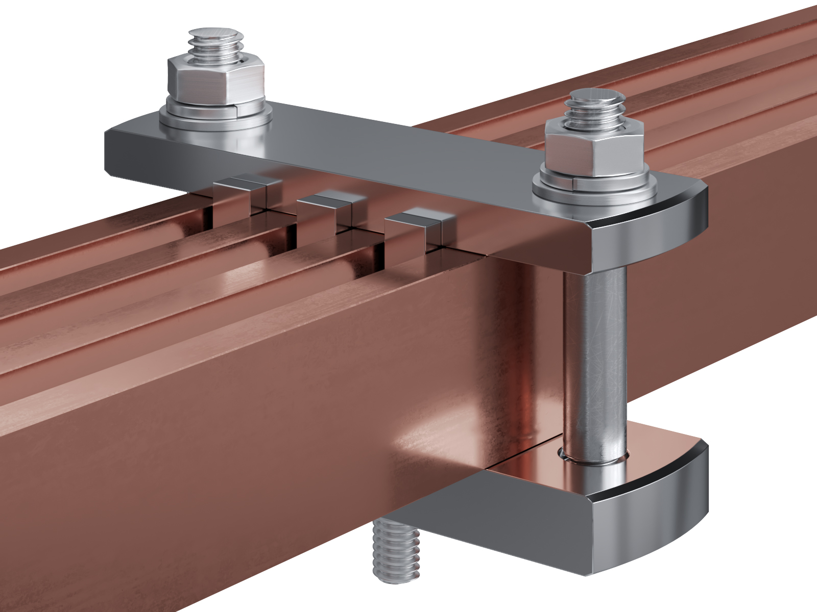 Schienenträger aus vernickeltem Messing zur Befestigung und Sicherung von Stromschienen aus Kupfer