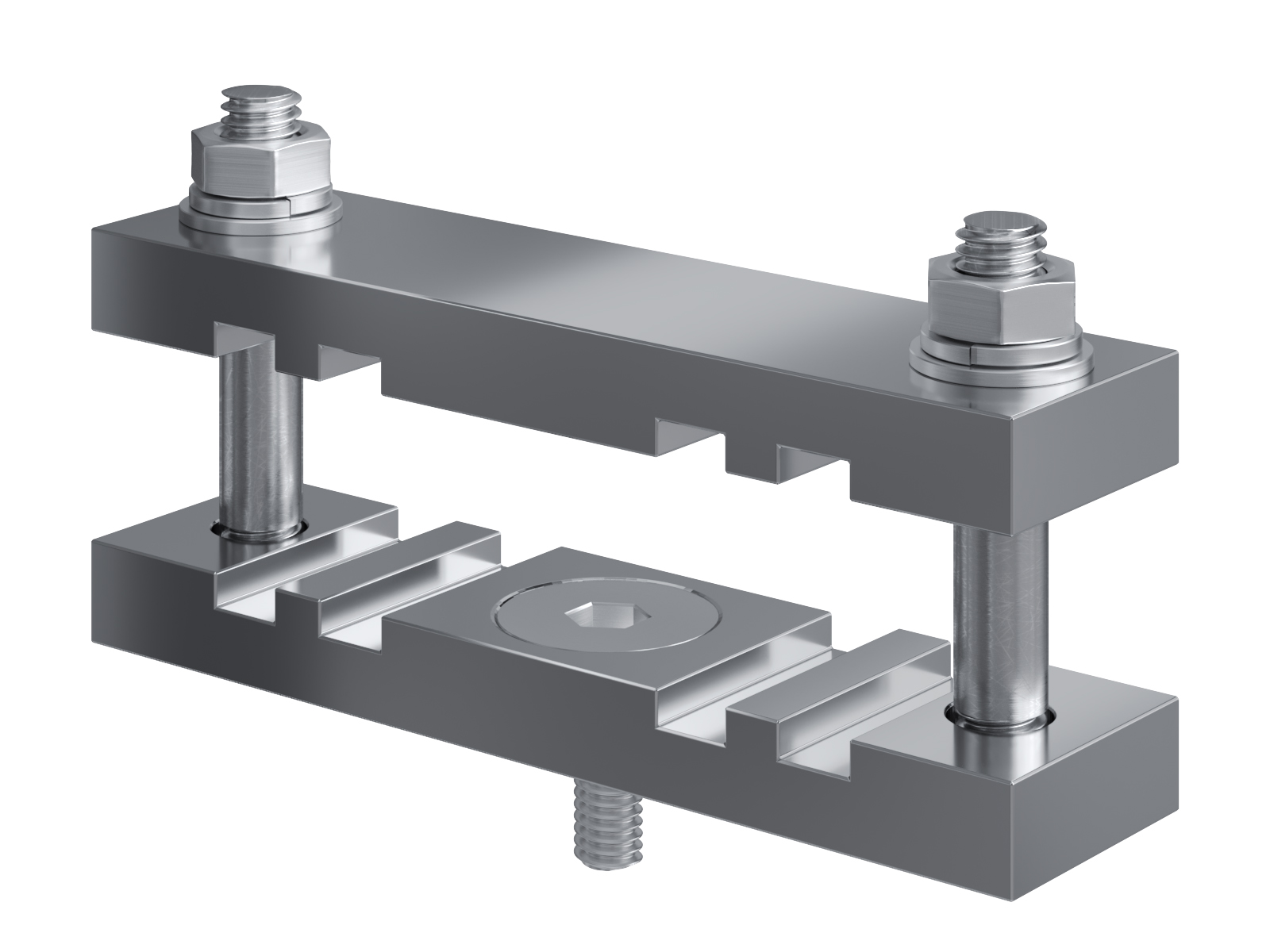 Schienenträger aus vernickeltem Messing zur Befestigung und Sicherung von Stromschienen aus Kupfer