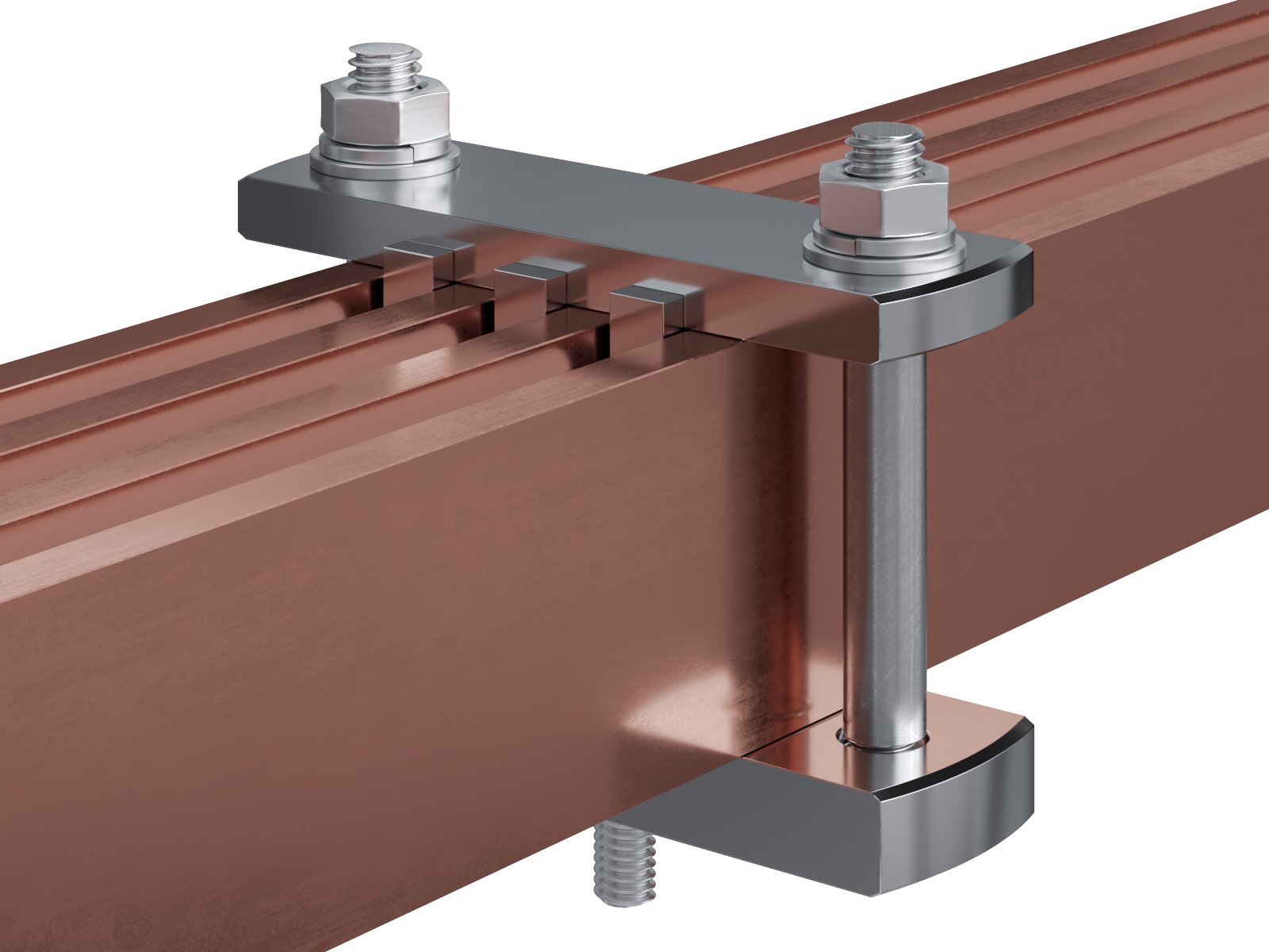 Schienenträger aus vernickeltem Messing zur Befestigung und Sicherung von Stromschienen aus Kupfer