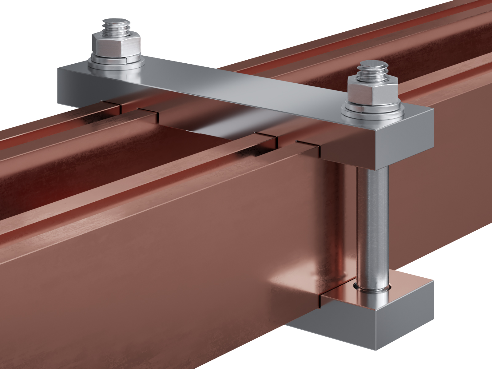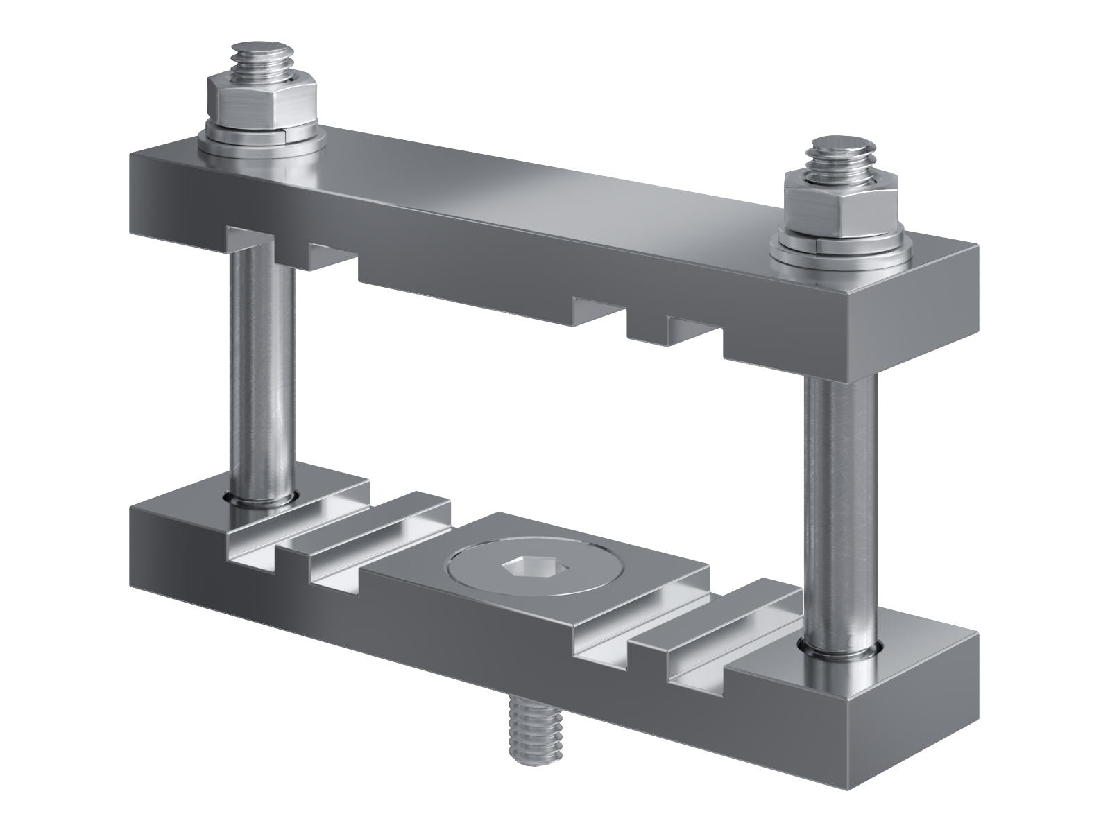 Schienenträger aus vernickeltem Messing zur Befestigung und Sicherung von Stromschienen aus Kupfer