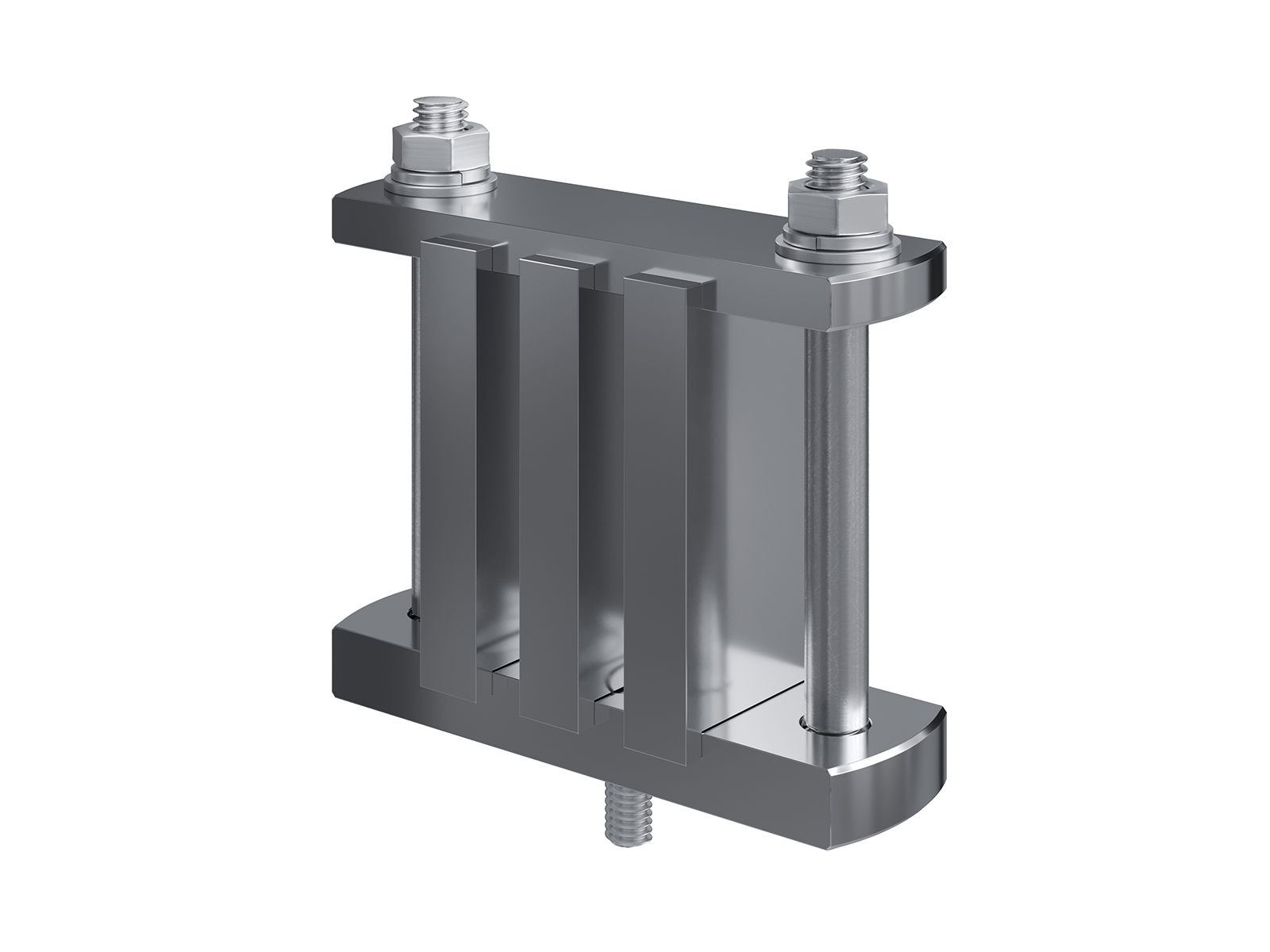 Schienenträger aus vernickeltem Messing zur Befestigung und Sicherung von Stromschienen aus Kupfer